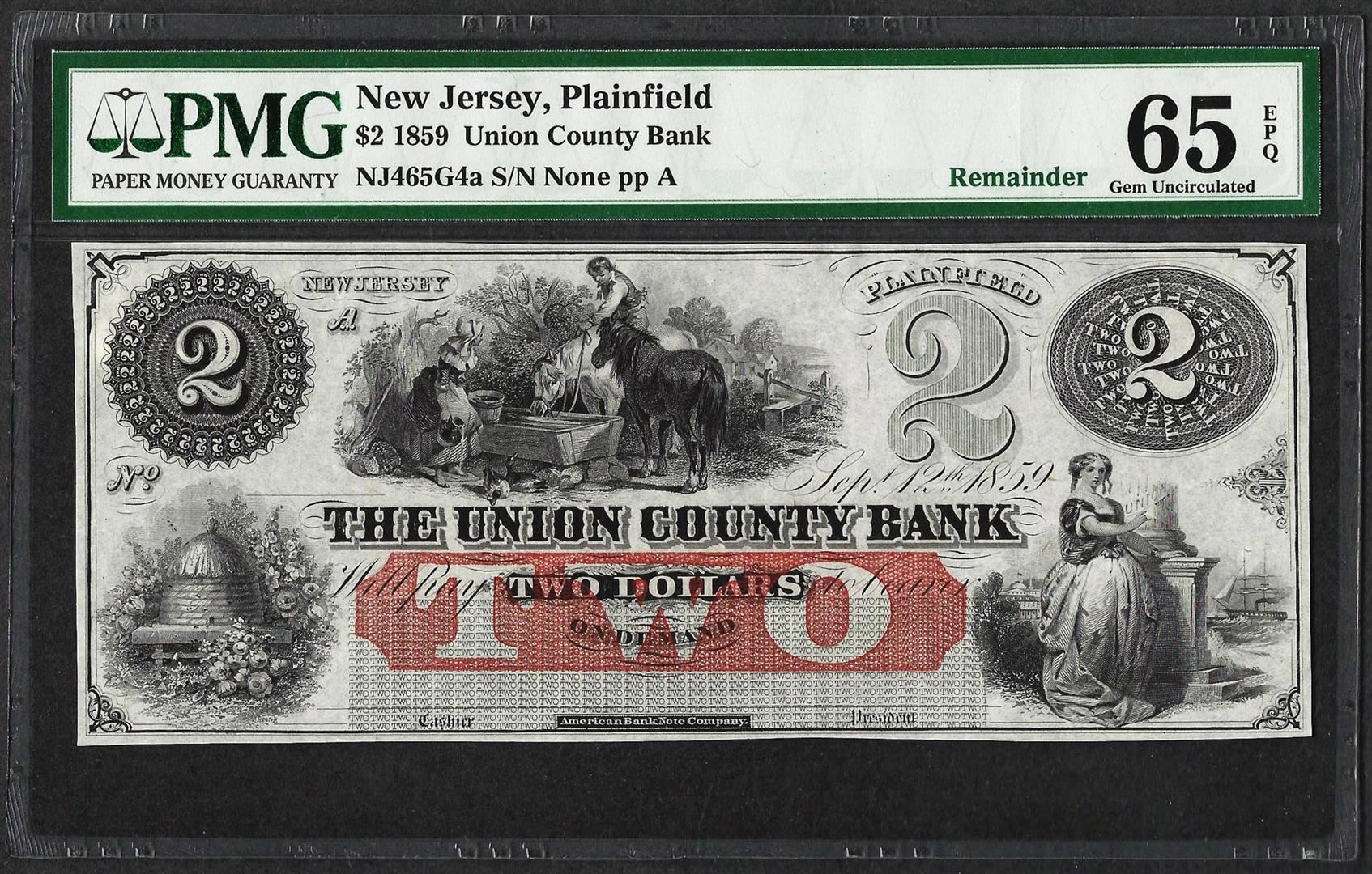 1859 $2 Union County Bank Plainfield, NJ Obsolete Note PMG Gem Uncirculated 65EP