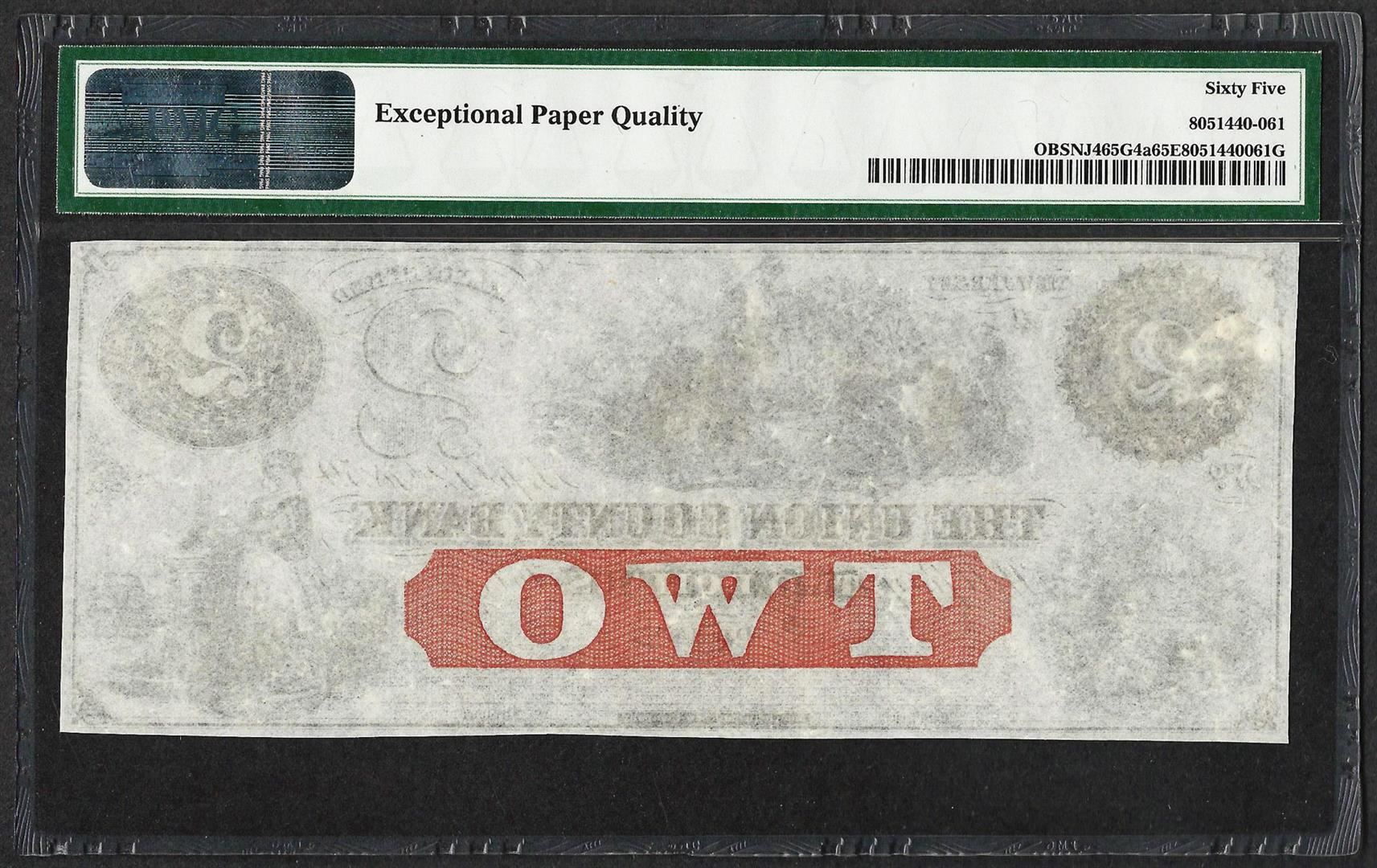 One 1859 $2 Union County Bank Plainfield, NJ Obsolete Note PMG Gem Uncirculated 65EPQ. PMG Certified.