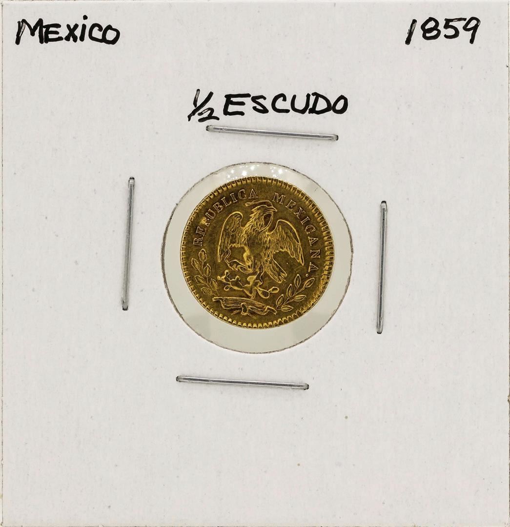 One 1859 Mexico 1/2 Escudo Gold Coin.