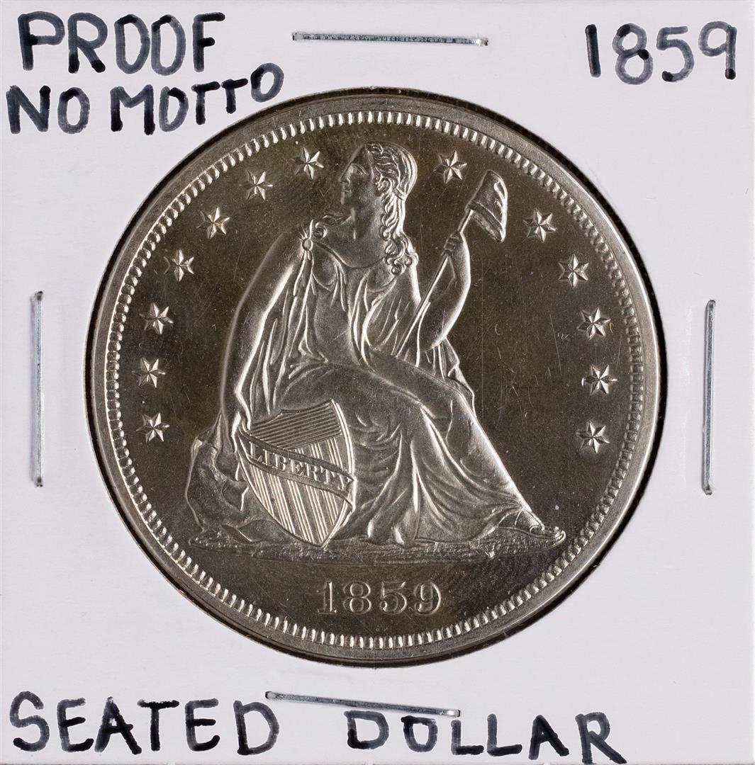 One 1859 No Motto $1 Proof Seated Liberty Silver Dollar Coin.