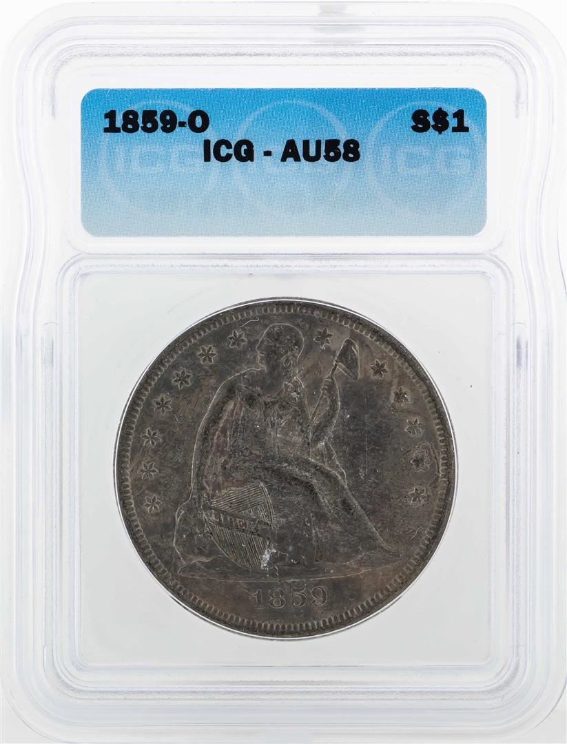 One 1859-O $1 Liberty Seated Coin ICG AU58. ICG Certified.