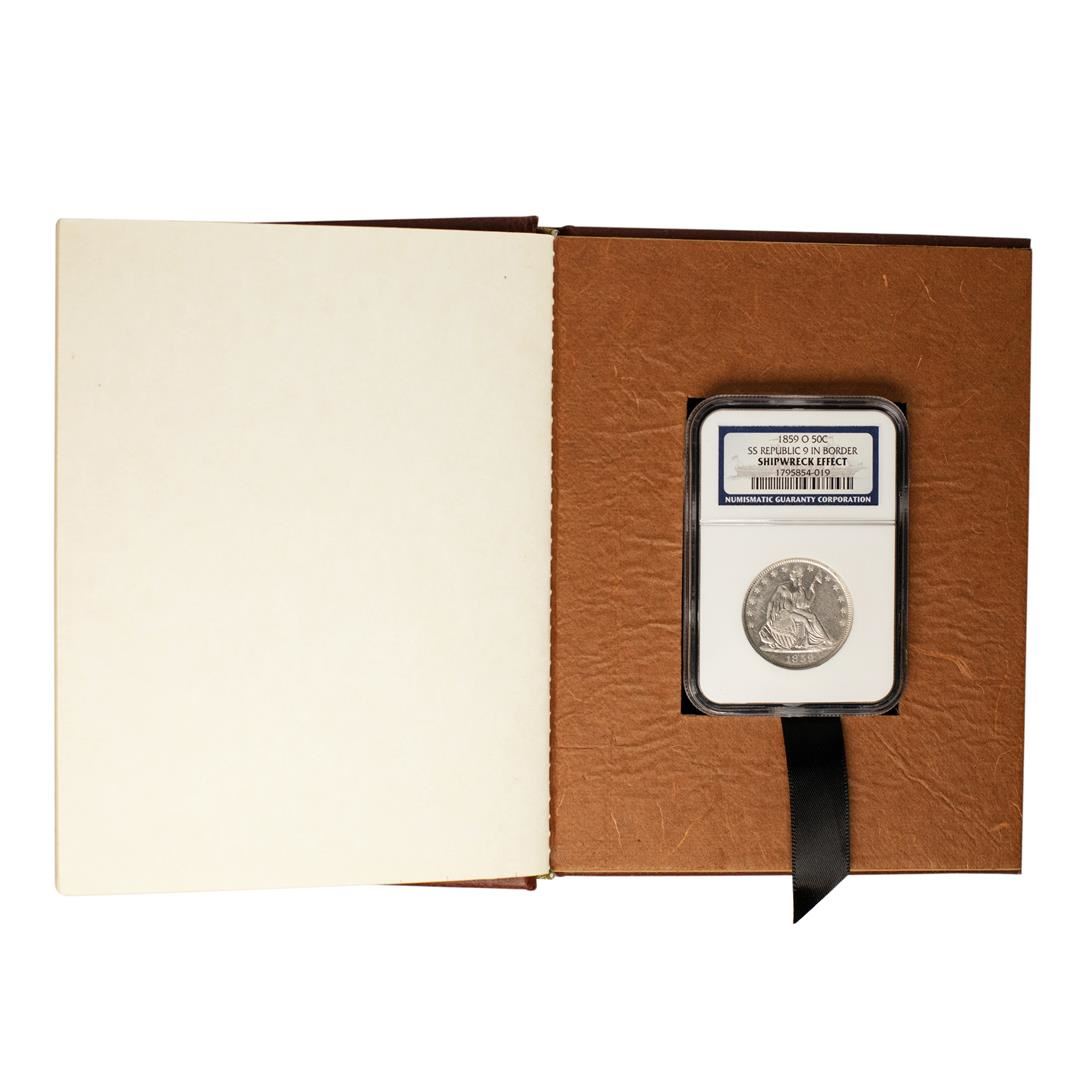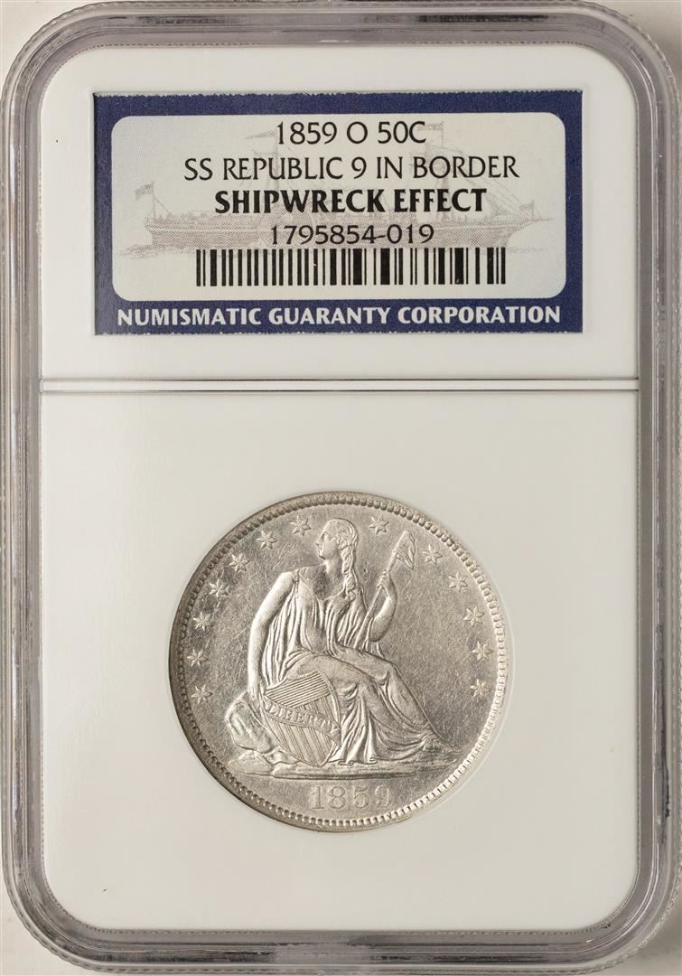 One 1859-O 9 in Border Seated Liberty Half Dollar Coin NGC Shipwreck Effect w/ Book. NGC Certified.