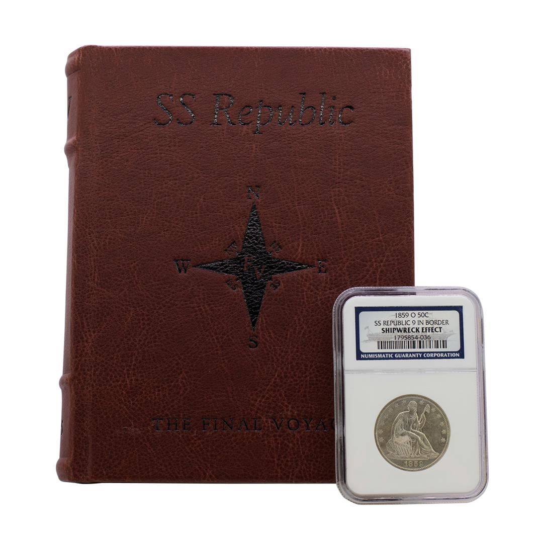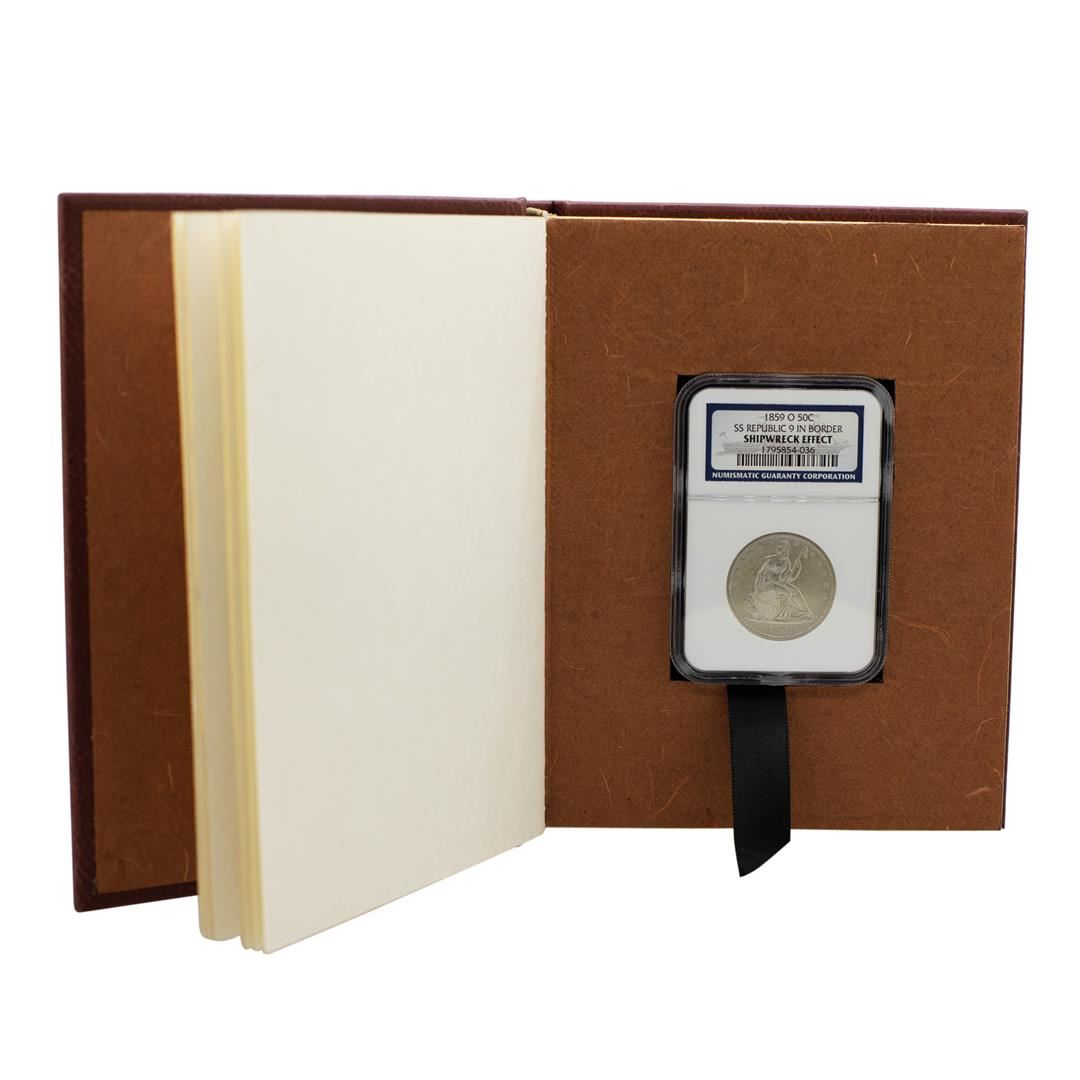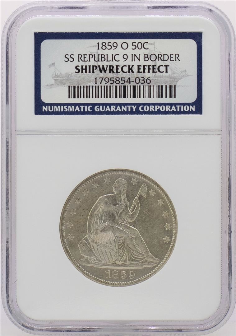 One 1859-O 9 in Border Seated Liberty Half Dollar Coin NGC Shipwreck Effect w/ Book. NGC Certified.