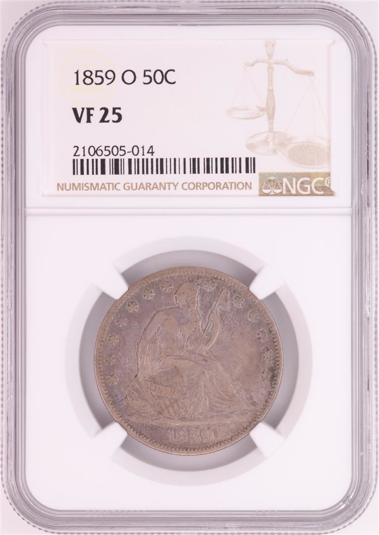 One 1859-O Seated Liberty Half Dollar Coin NGC VF25. NGC Certified.