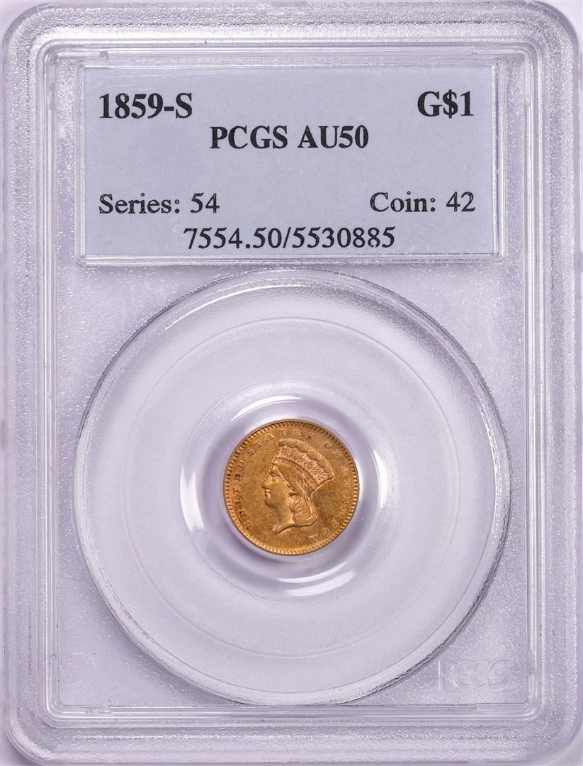 One 1859-S $1 Indian Princess Head Gold Dollar Coin PCGS AU50. PCGS Graded.