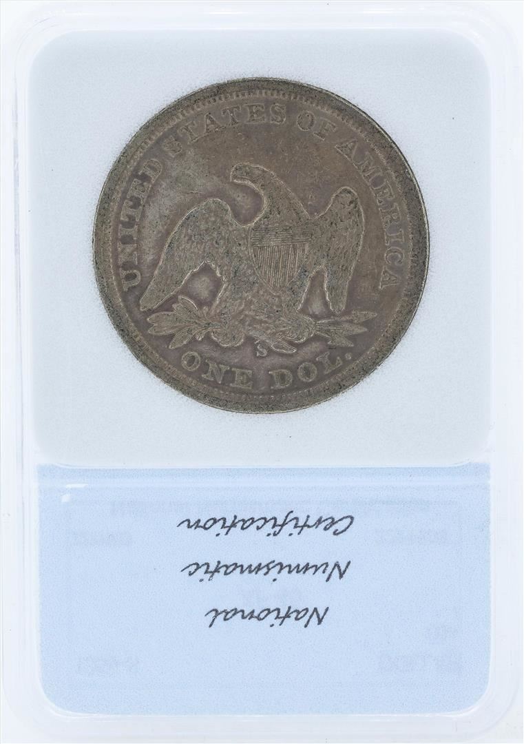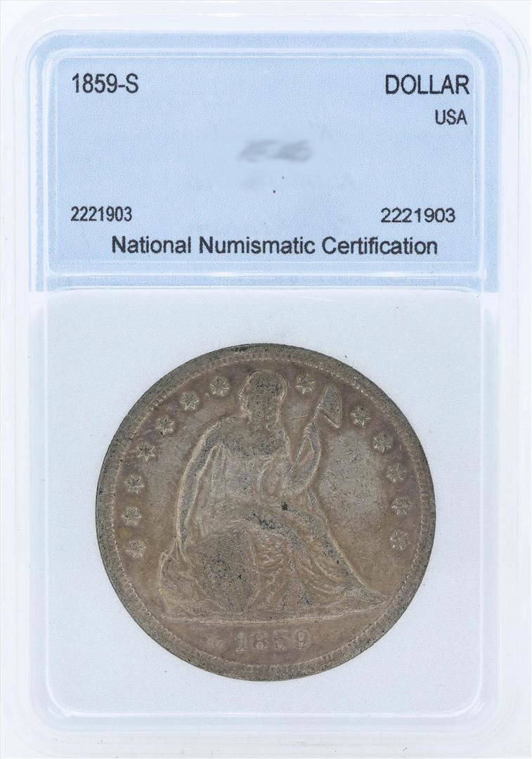 One 1859-S $1 Liberty Seated Liberty Dollar. This coin has been graded by "National Numismatic Certification" company. However, since it is not one of the main numismatic certification companies that we currently recognize, we purposely blurred out the assigned grade of the coin to avoid any confusion. We encourage each bidder to make their own determination as to the grade & value of the coin.