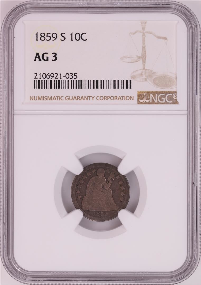 One 1859-S Seated Liberty Dime Coin NGC AG3. NGC Certified.