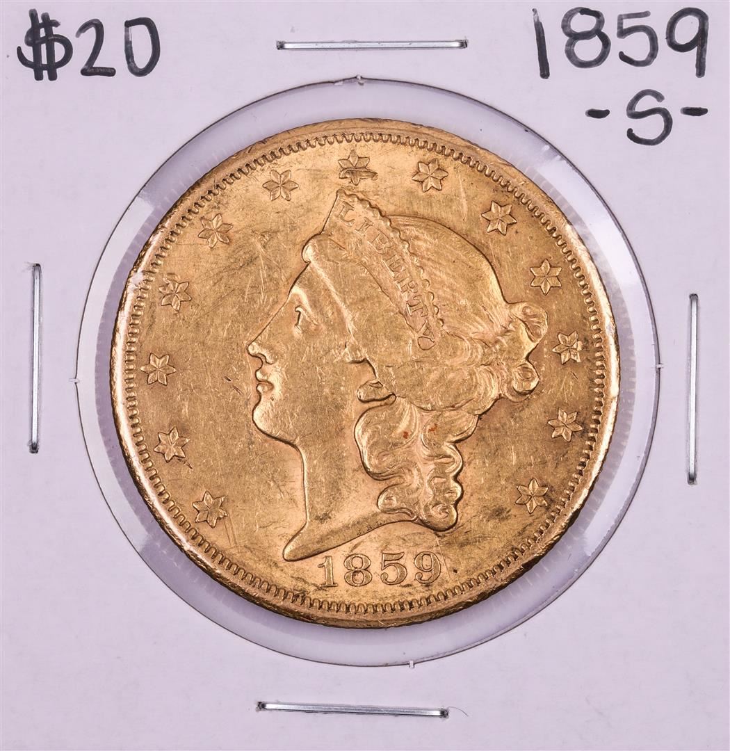 One 1859-S Type 1 $20 Liberty Head Double Eagle Gold Coin.