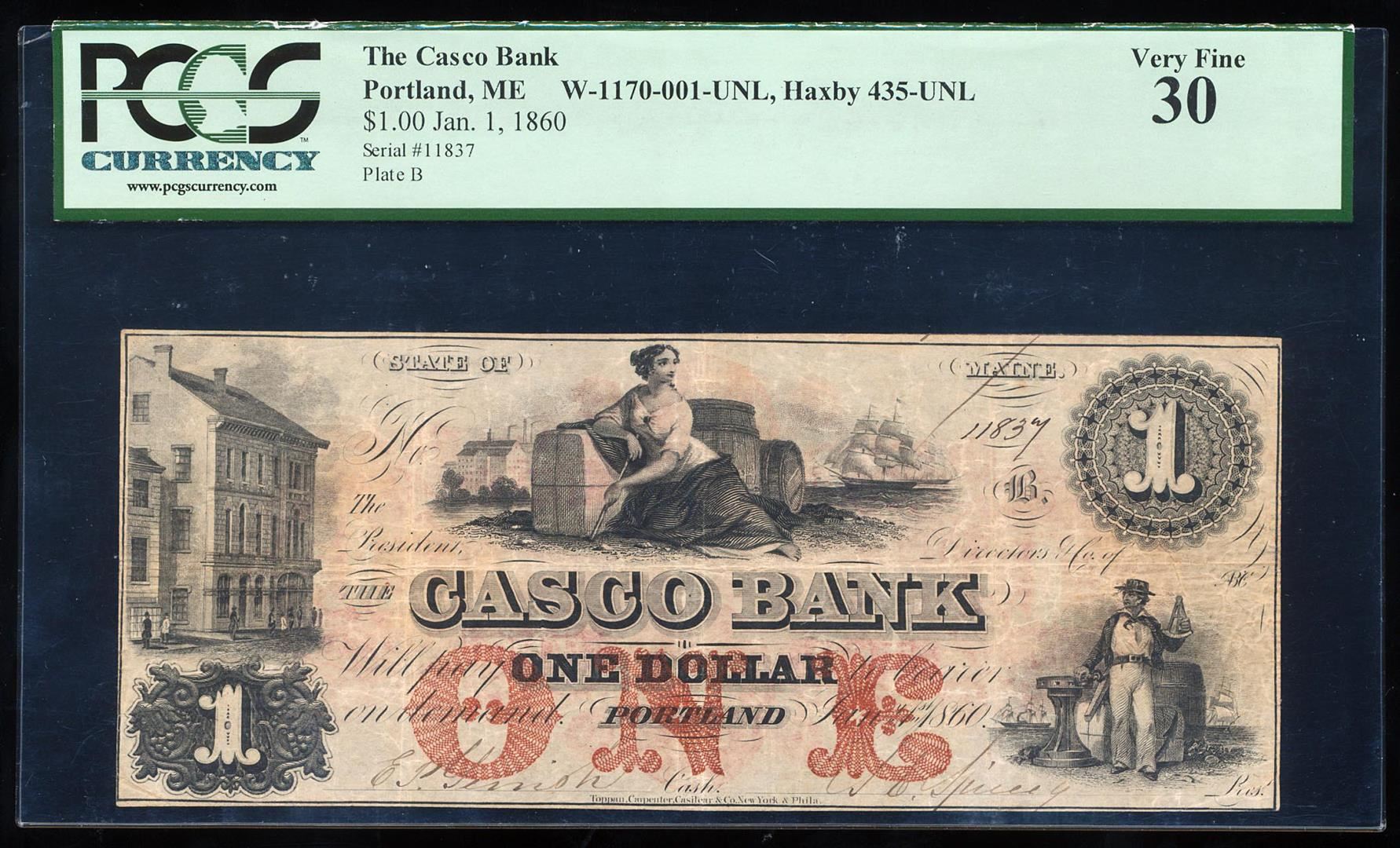 One 1860 $1 The Casco Bank Portland, ME Obsolete Bank Note PCGS Very Fine 30. PCGS Graded.