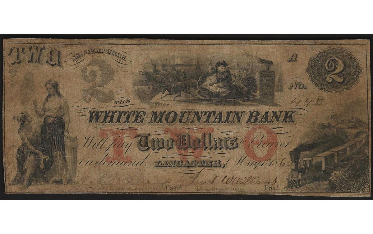 One 1860 $2 Lancaster, NH White Mountain Bank Santa Claus Obsolete Bank Note.