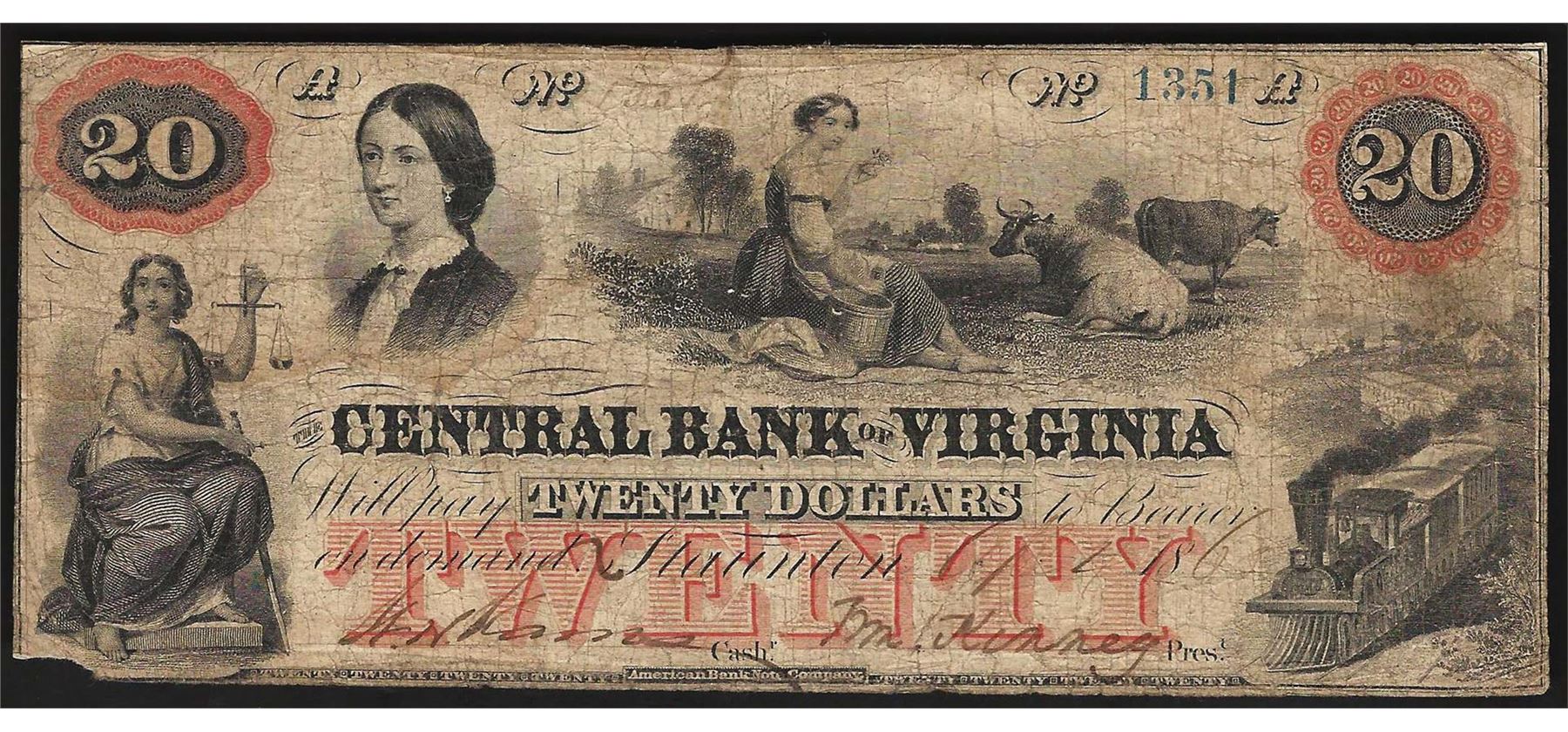 One 1860 $20 The Central Bank of Virginia Obsolete Note.