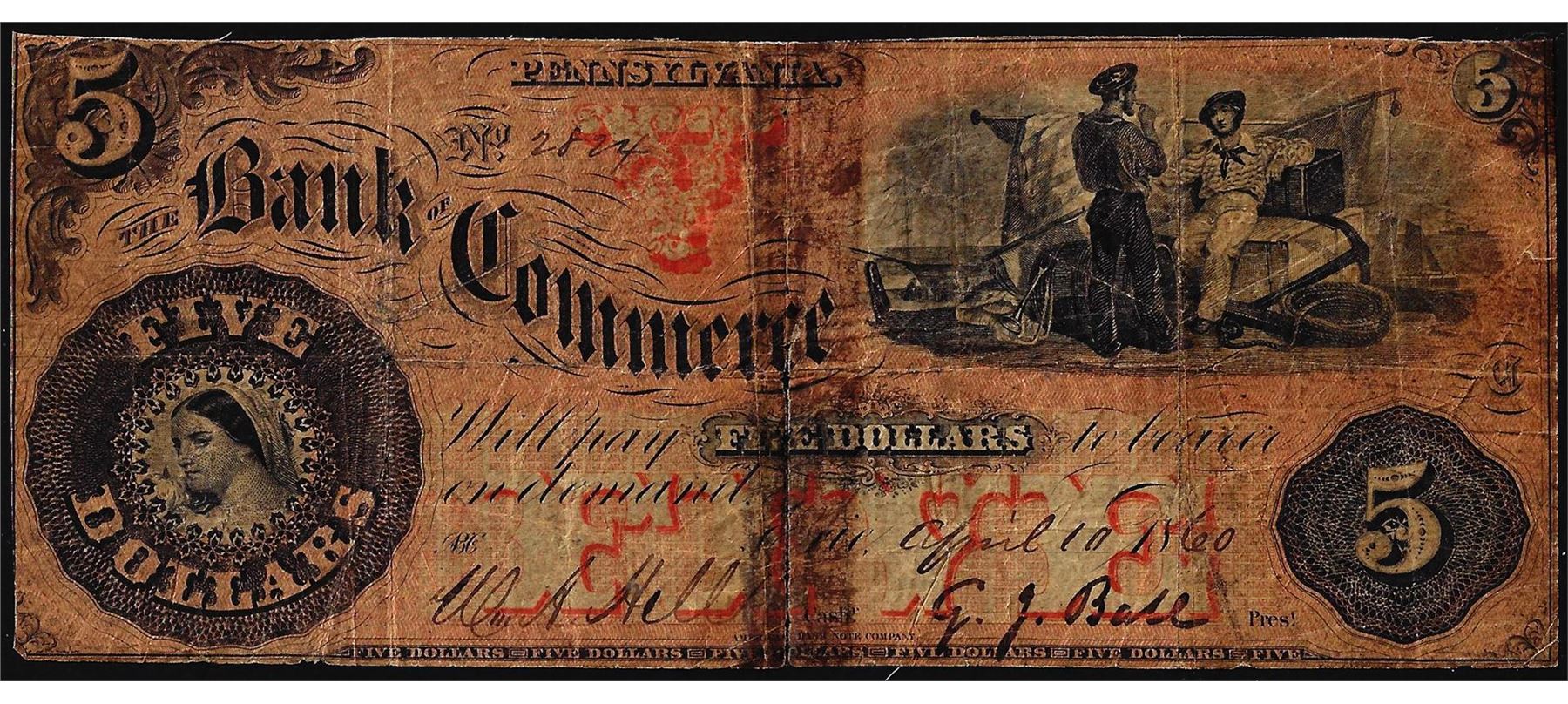 One 1860 $5 The Bank of Commerce Erie, PA Obsolete Note.