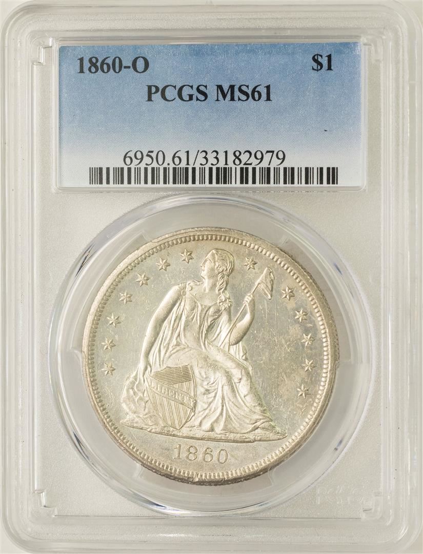 One 1860-O $1 Seated Liberty Silver Dollar Coin PCGS MS61. PCGS Graded.