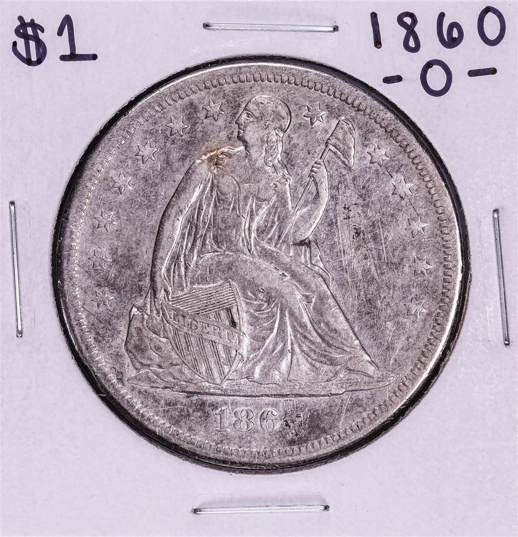 One 1860-O $1 Seated Liberty Silver Dollar Coin, please note there appears to be some damage to the date of the coin as shown in pictures.