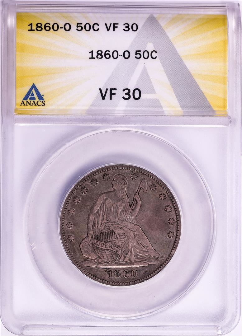 One 1860-O Seated Liberty Half Dollar Coin ANACS VF30. ANACS Certified.