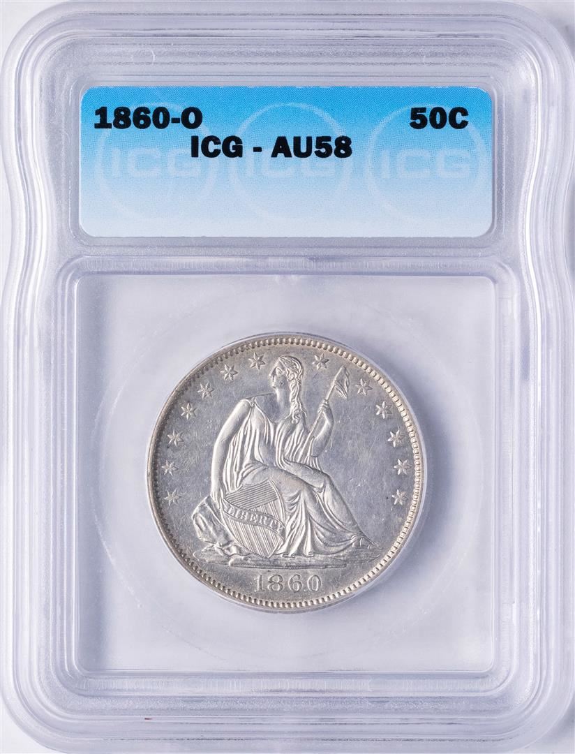 One 1860-O Seated Liberty Half Dollar Coin ICG AU58. ICG Certified.
