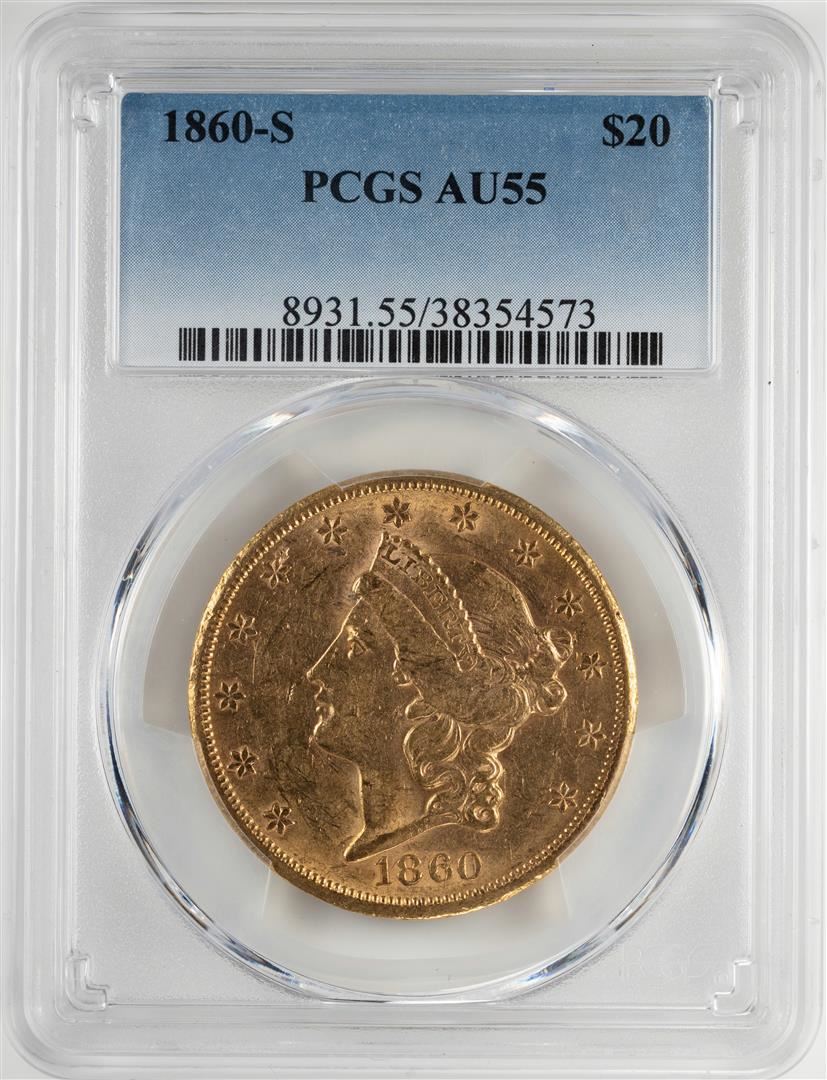 One 1860-S $20 Liberty Head Double Eagle Gold Coin PCGS AU55. PCGS Graded.