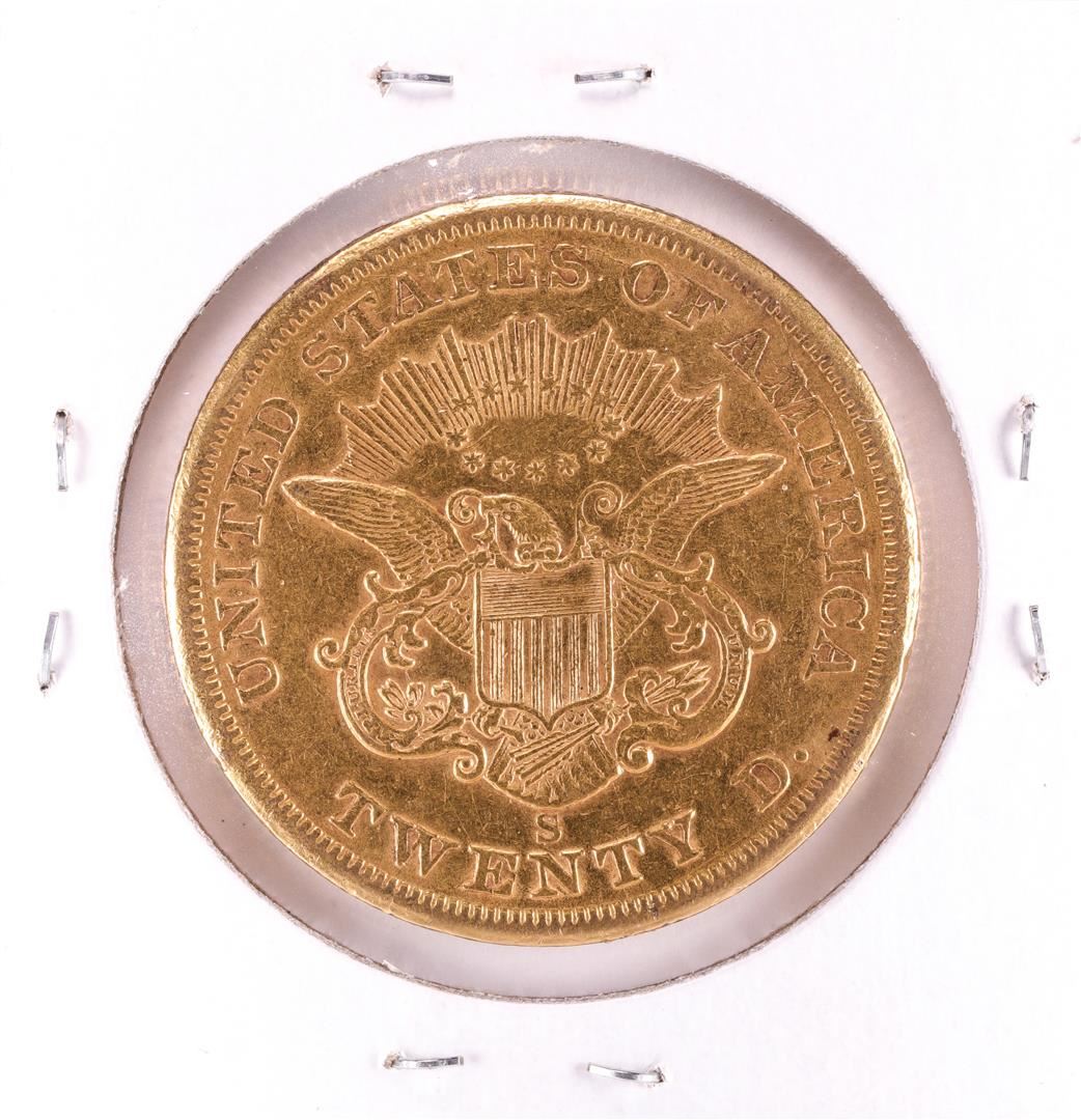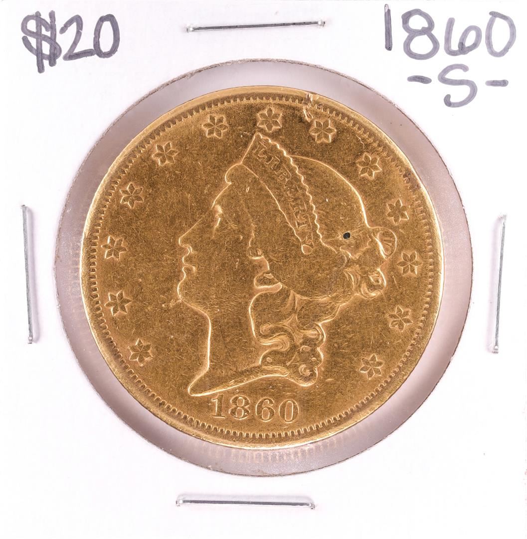 One 1860-S $20 Liberty Head Double Eagle Gold Coin.