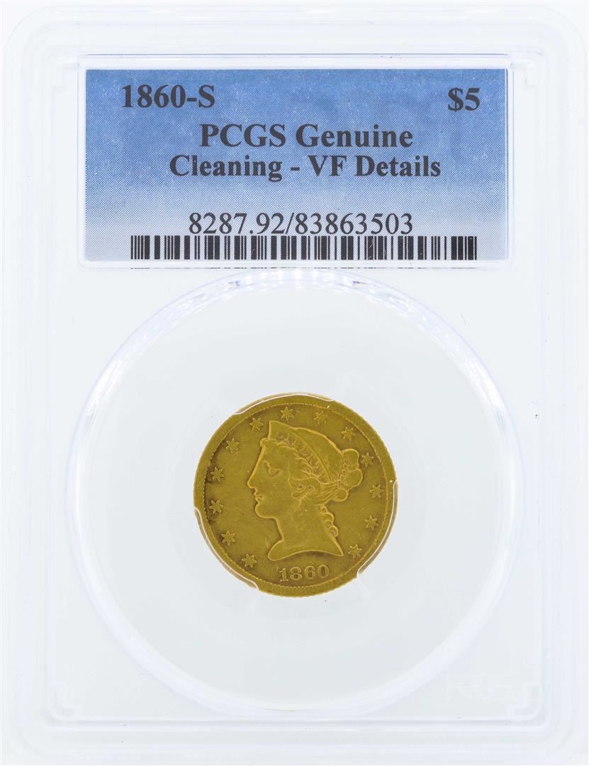 One 1860-S $5 Liberty Head Half Eagle Gold Coin PCGS Genuine Details. PCGS Graded.