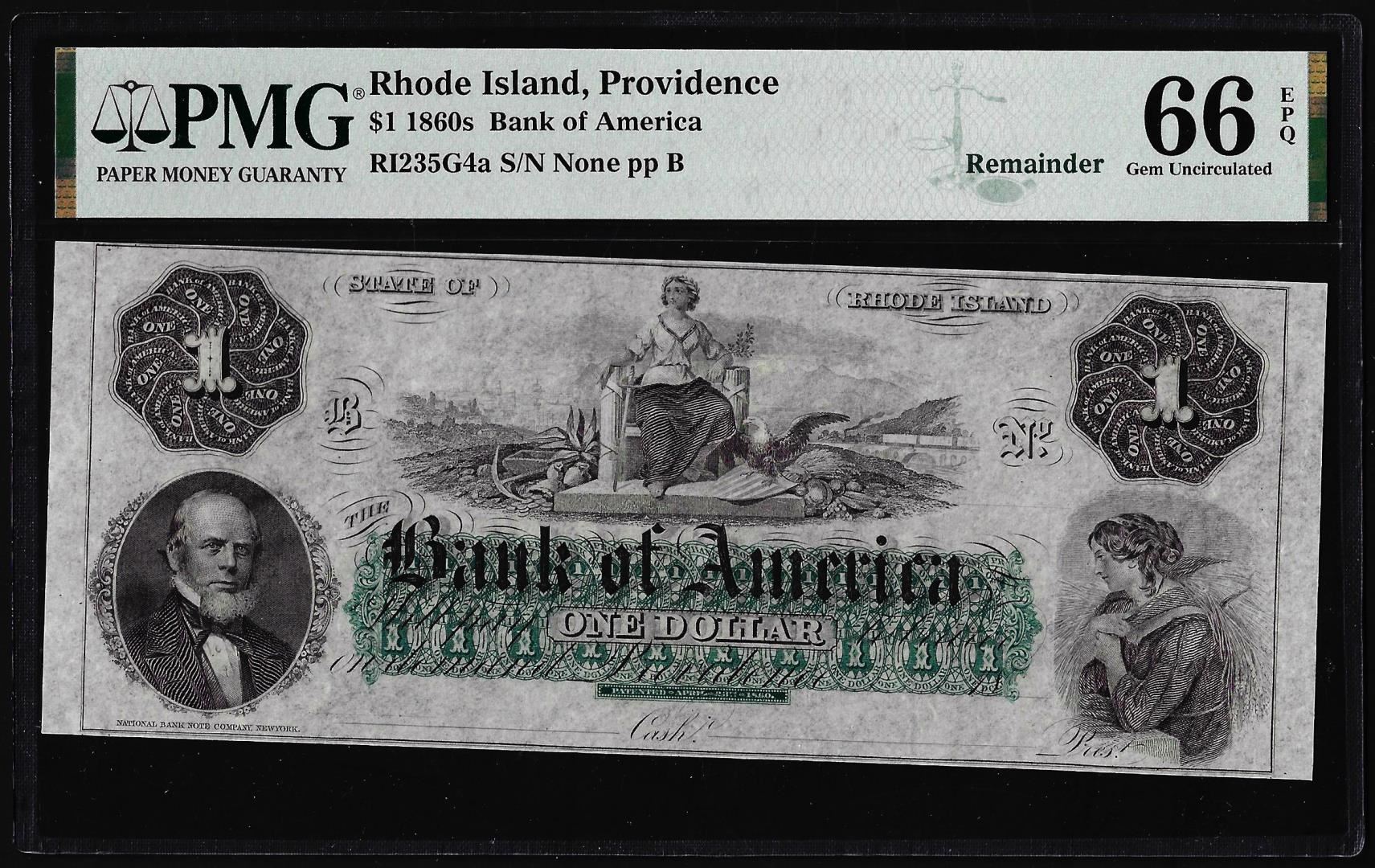 One 1860's $1 Bank of America Providence, RI Obsolete Note PMG Gem Uncirculated 66EPQ. PMG Certified.