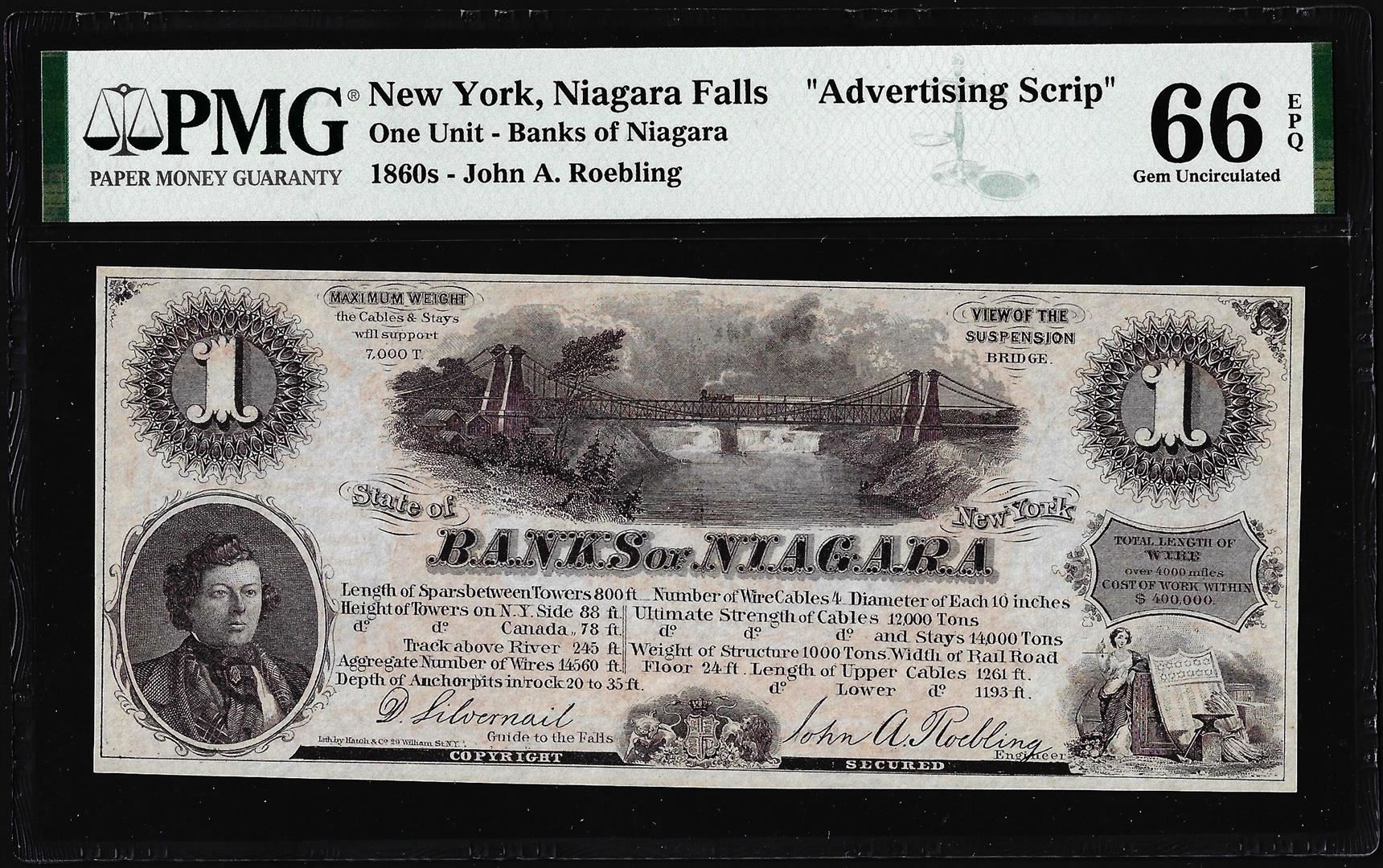 One 1860's $1 Banks of Niagara New York Advertising Script PMG Gem Uncirculated 66EPQ. PMG Certified.