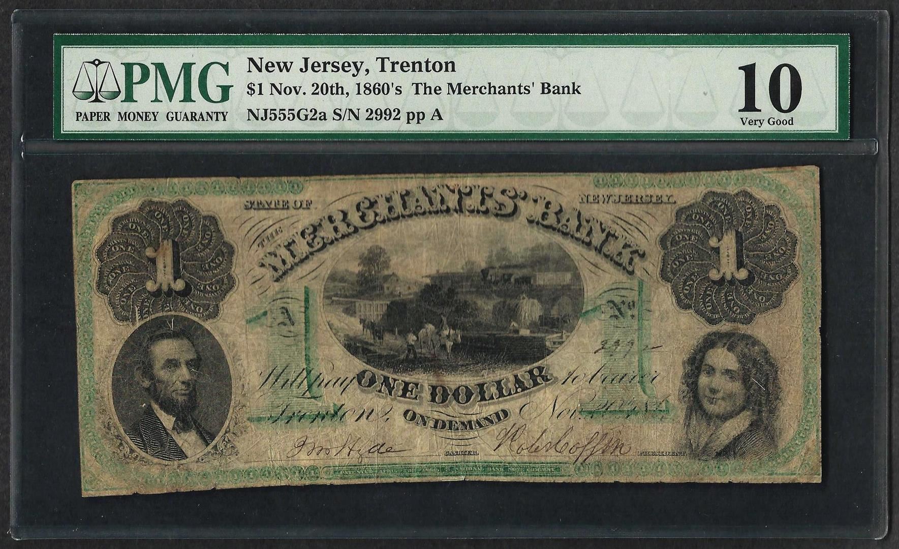One 1860's $1 The Merchants Bank Trenton, New Jersey Obsolete Note PMG Very Good 10. PMG Certified.