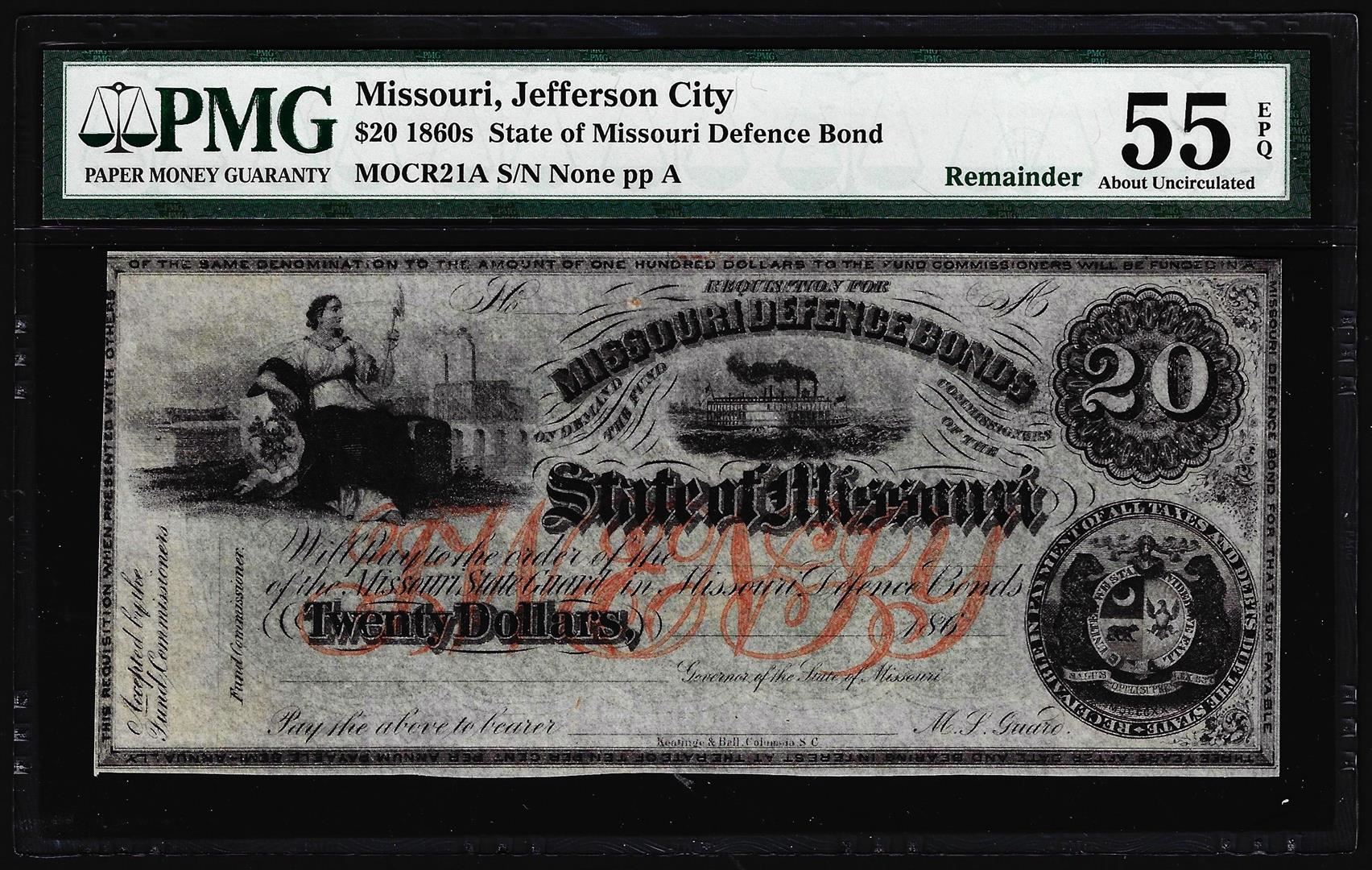 One 1860's $20 State of Missouri Defence Bond Obsolete Note PMG About Uncirculated 55EPQ. PMG Certified.
