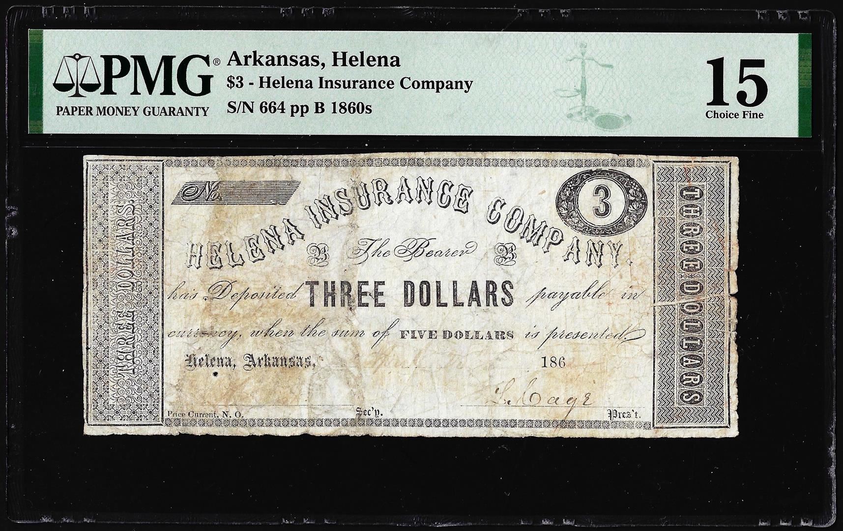 One 1860's $3 Helena Insurance Company Helena, Arkansas Obsolete Note PMG Choice Fine 15. PMG Certified.