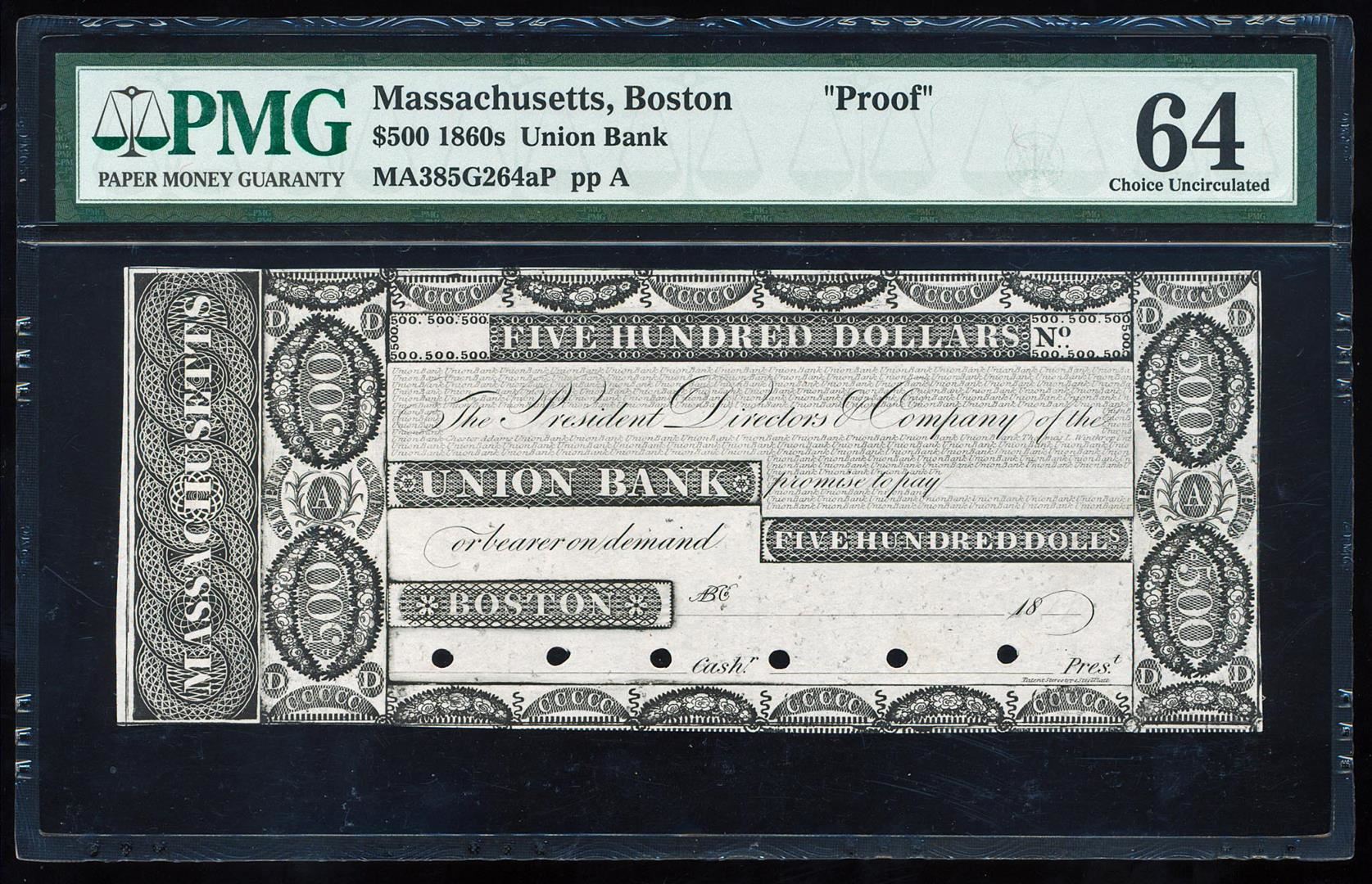 One 1860's $500 Union Bank Boston, MA Proof Obsolete Note PMG Choice Uncirculated 64. PMG Certified.