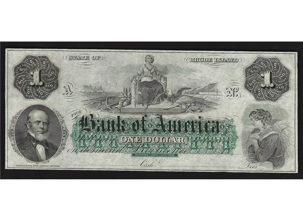 One 1860s $1 Bank of America Rhode Island Obsolete Bank Note.