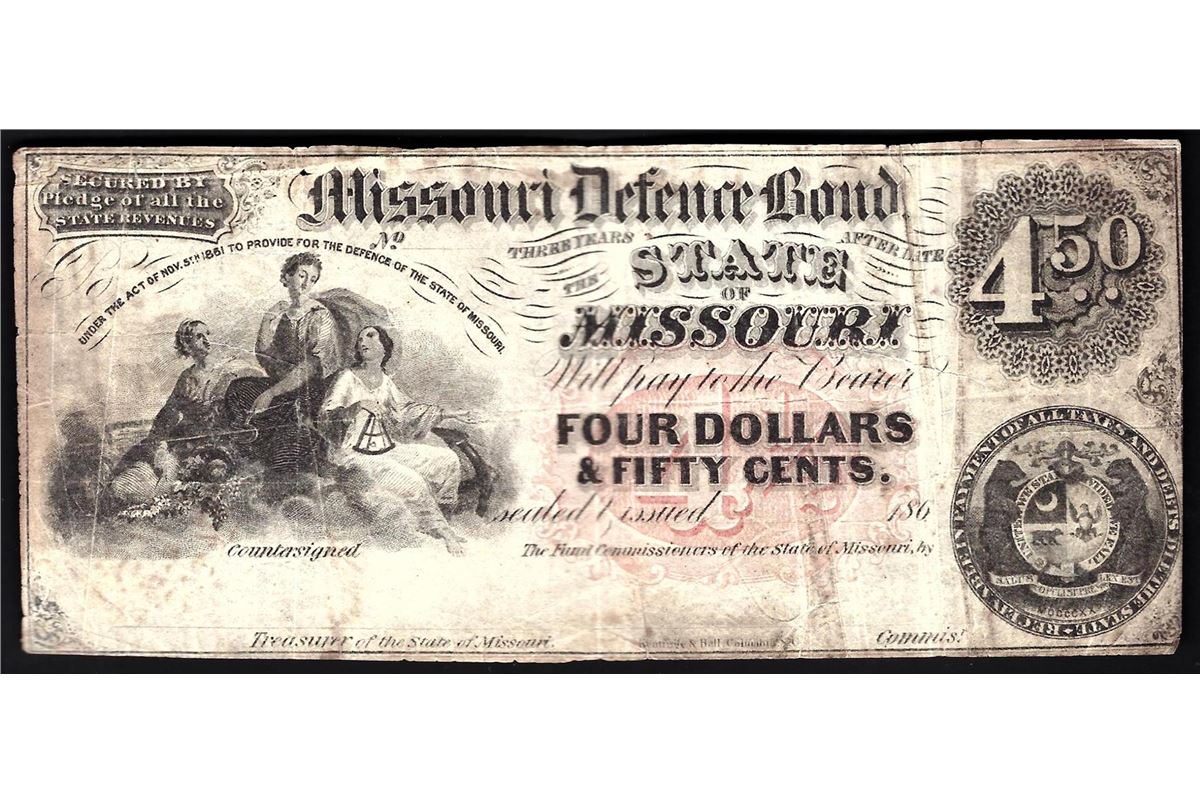 One 1860s $4.50 Missouri Defence Bond State of Missouri Obsolete Bank Note.