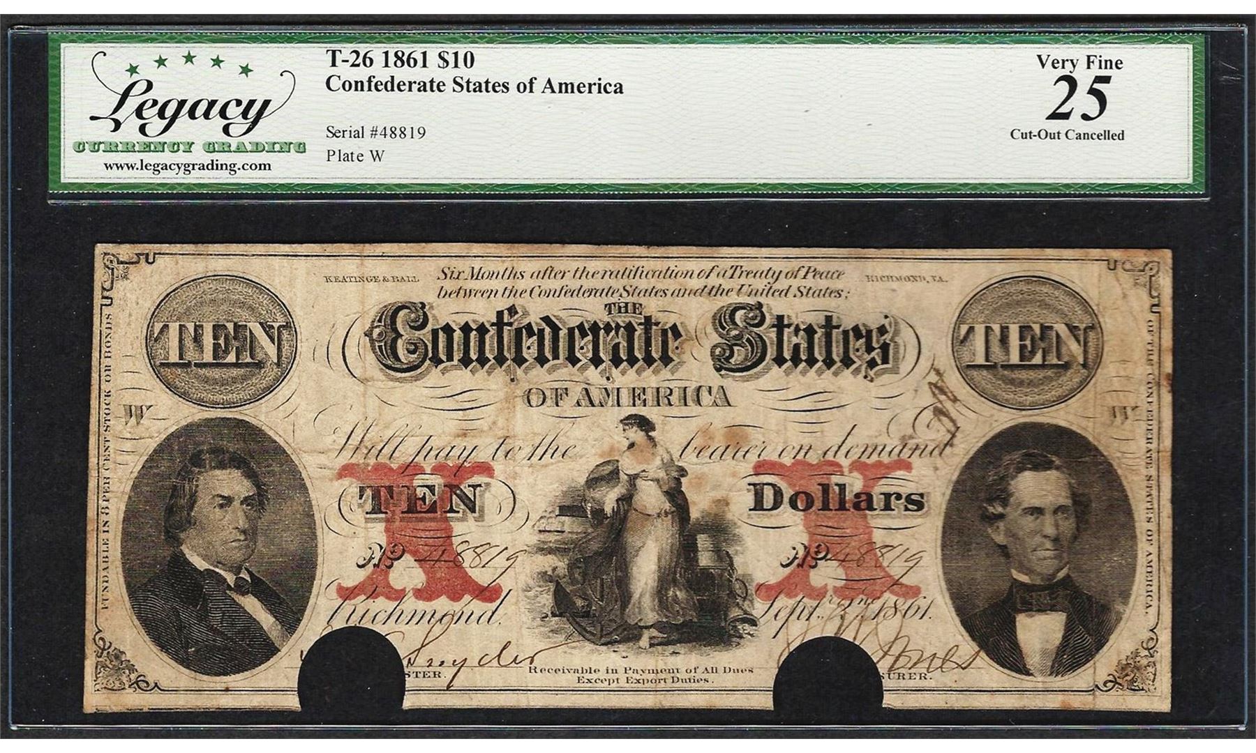 1861 $10 Confederate States of America Note T-26 Legacy Very Fine 25
