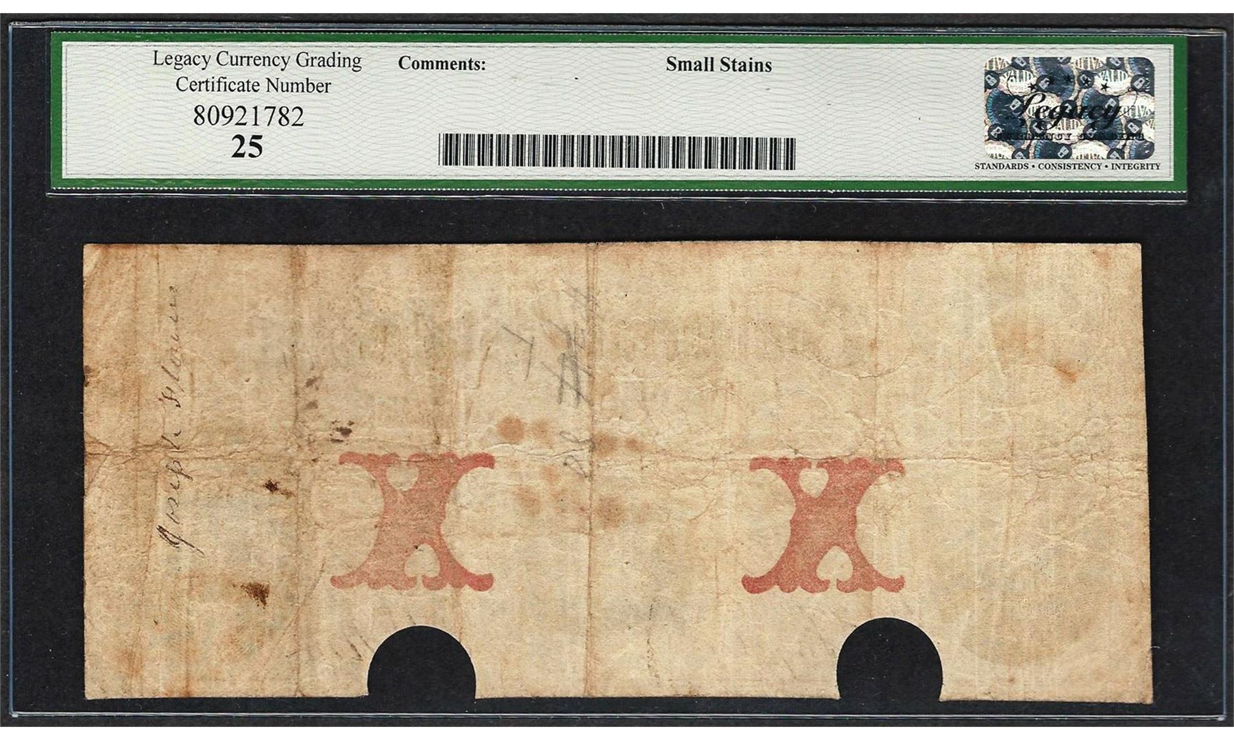 One 1861 $10 Confederate States of America Note T-26 Legacy Very Fine 25. Legacy Graded.