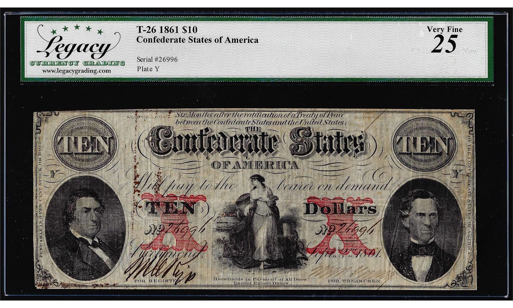 One 1861 $10 Confederate States of America Note T-26 Legacy Very Fine 25. Legacy Graded.