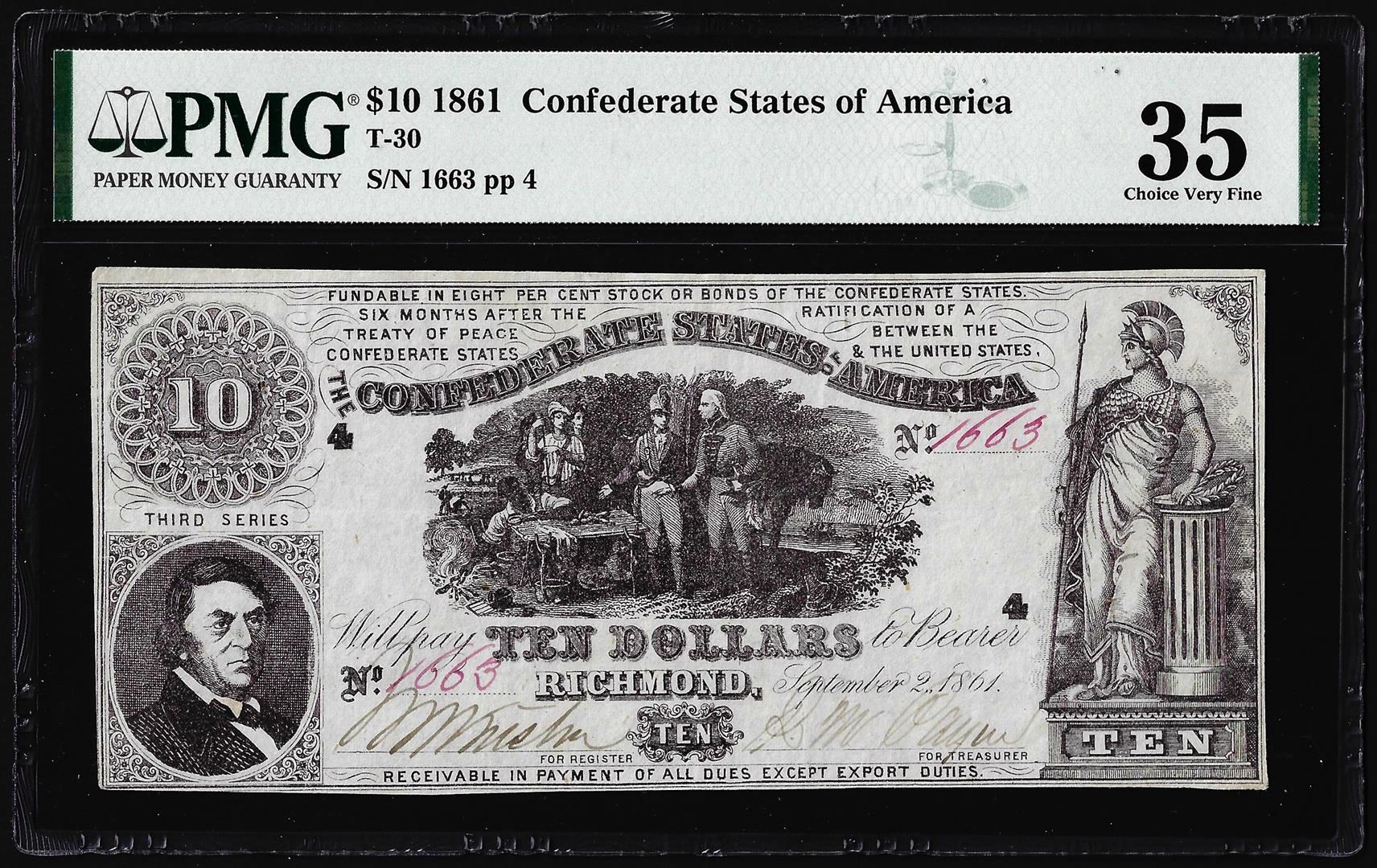 1861 $10 Confederate States of America Note T-30 PMG Choice Very Fine 35