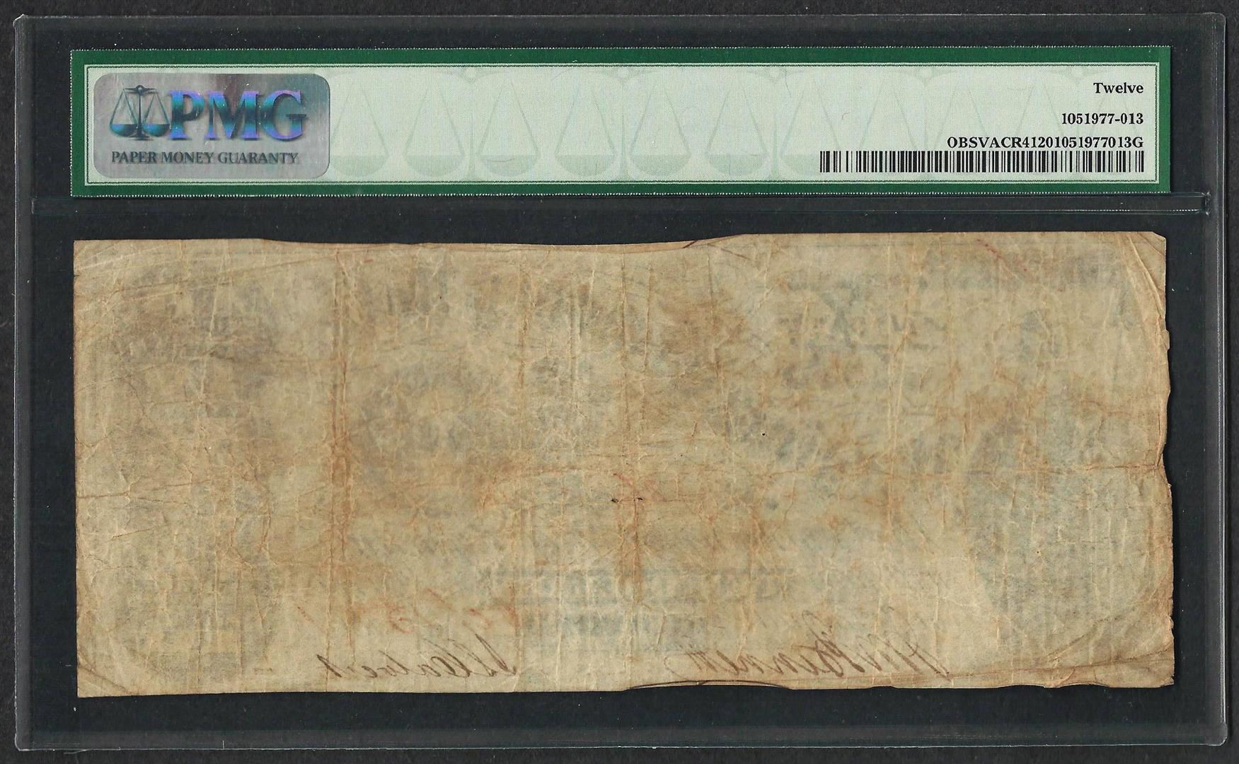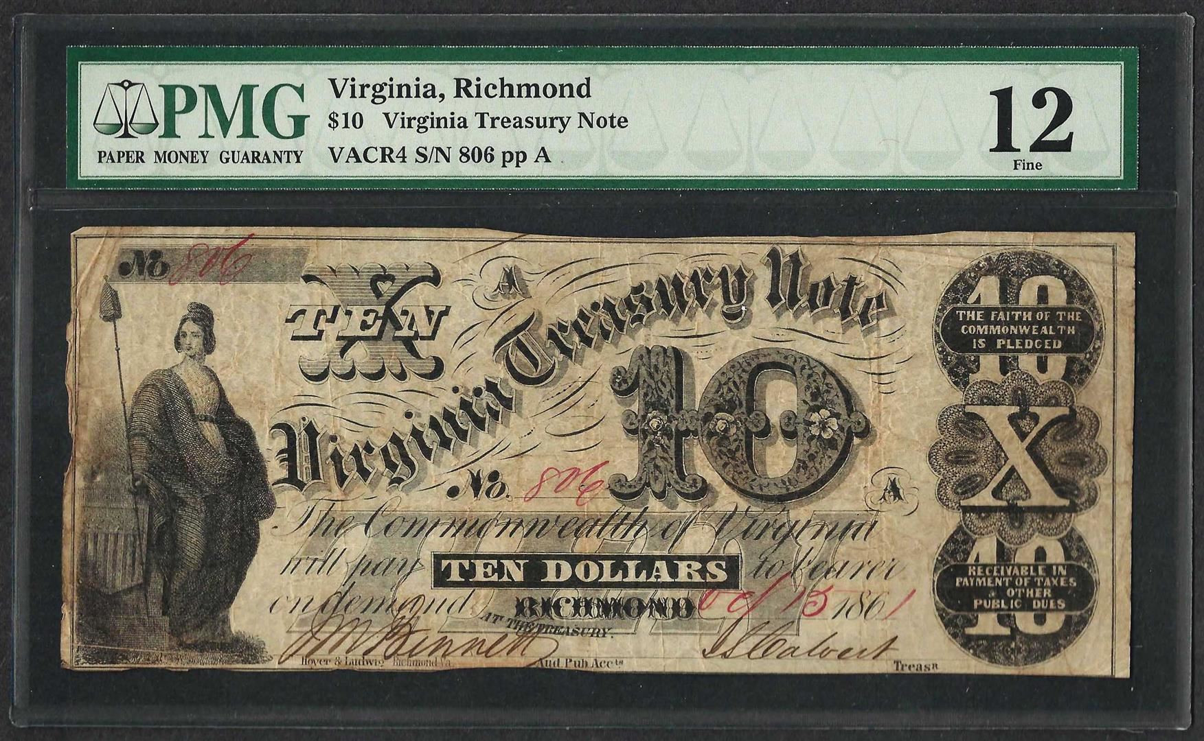 One 1861 $10 Virginia Treasury Note Obsolete Note PMG Fine 12. PMG Certified.