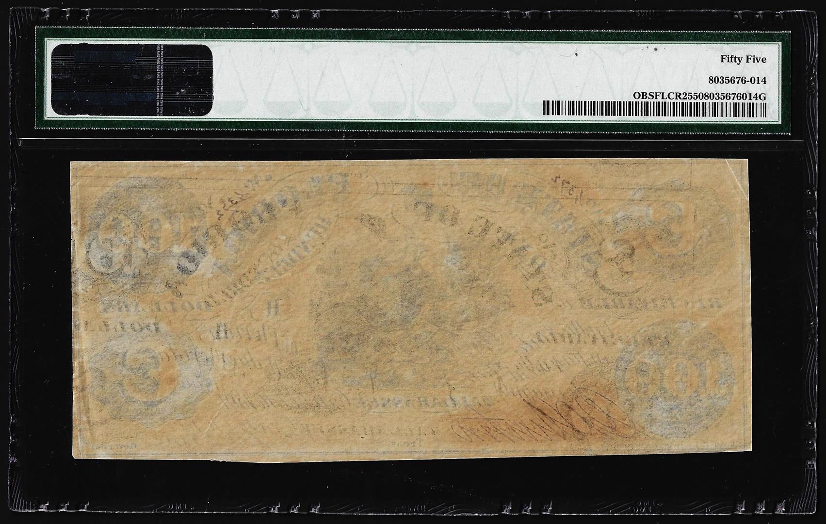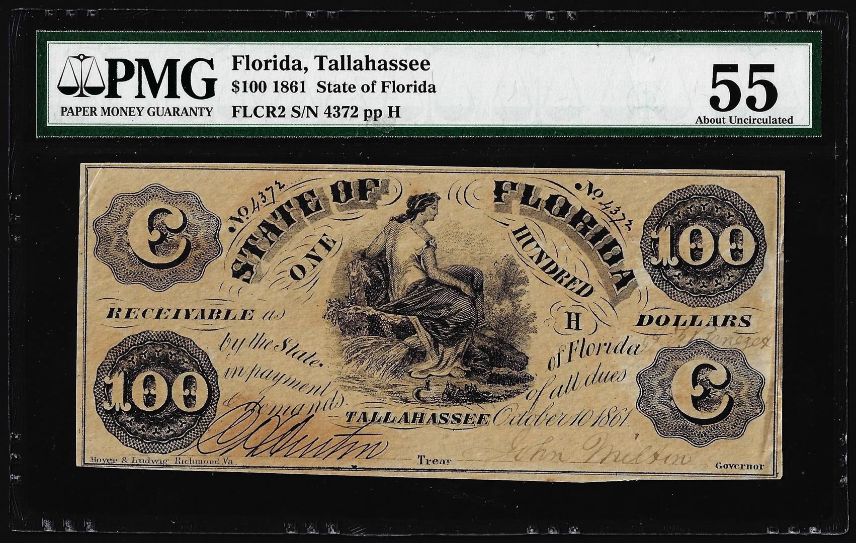 One 1861 $100 State of Florida Tallahassee Cr.2 Obsolete Note PMG About Uncirculated 55. PMG Certified.