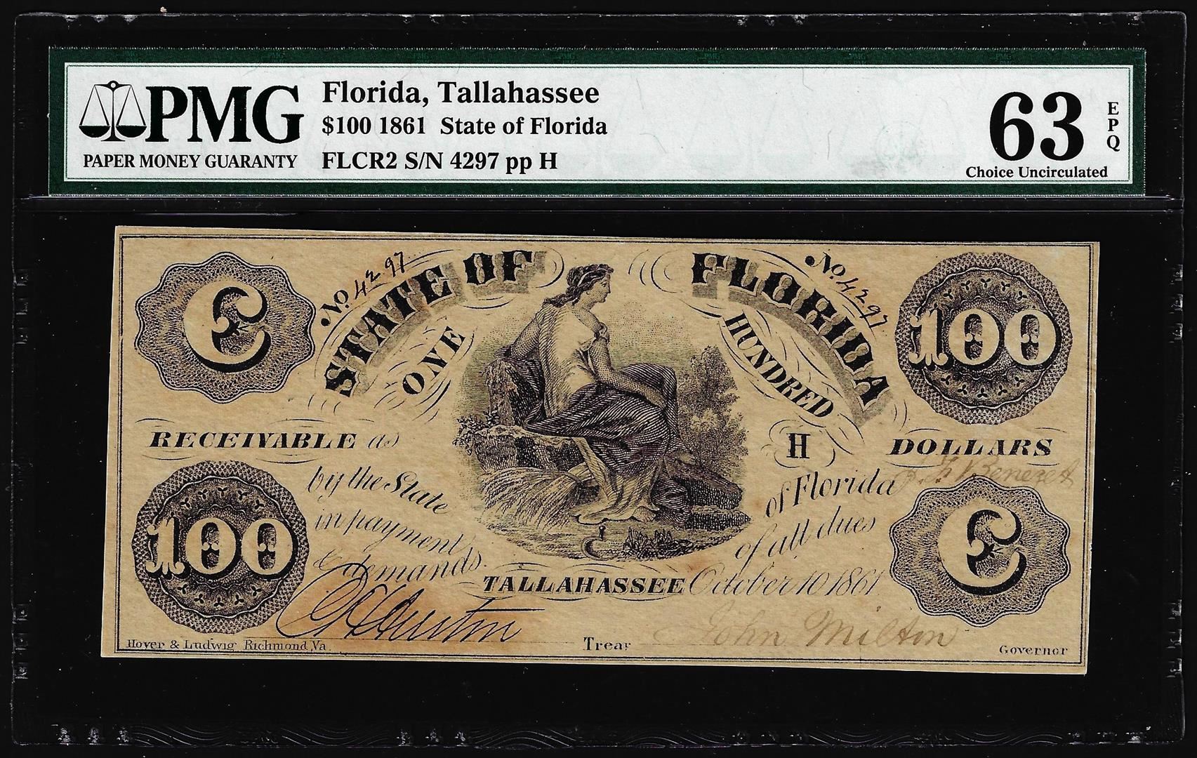 1861 $100 State of Florida Tallahassee Cr.2 Obsolete Note PMG Ch. Uncirculated 63EPQ