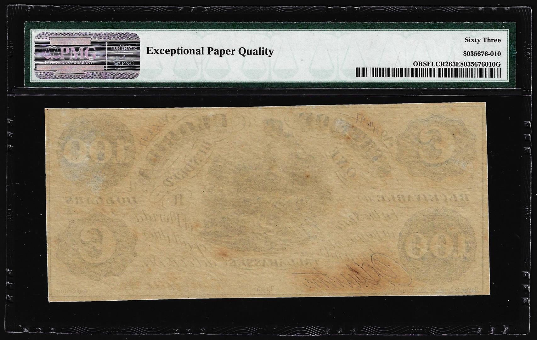 One 1861 $100 State of Florida Tallahassee Cr.2 Obsolete Note PMG Ch. Uncirculated 63EPQ. PMG Certified.