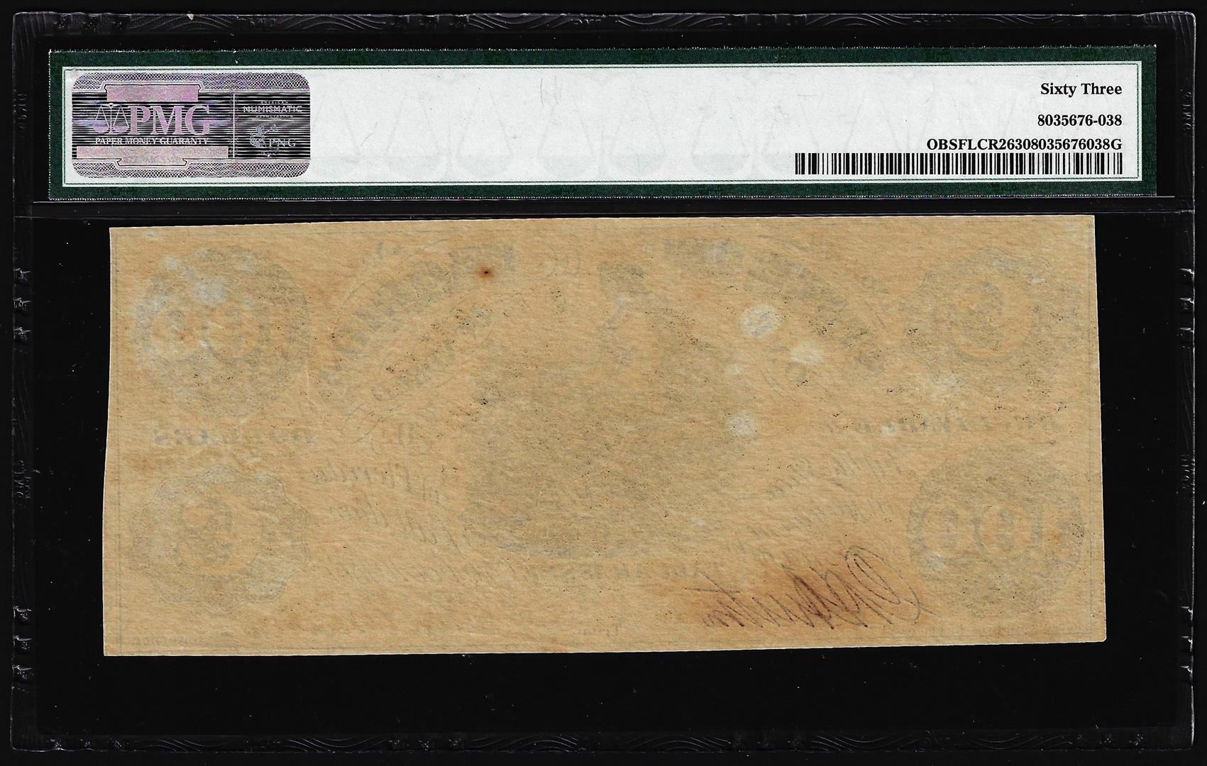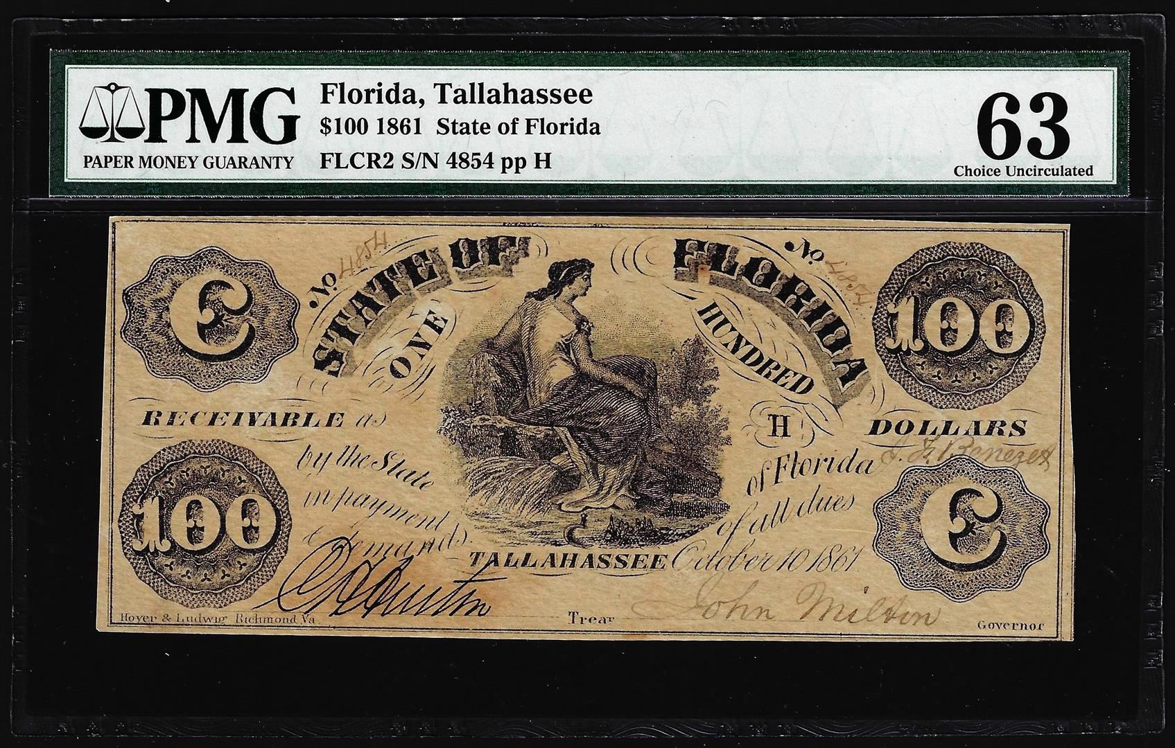 One 1861 $100 State of Florida Tallahassee Cr.2 Obsolete Note PMG Choice Uncirculated 63. PMG Certified.