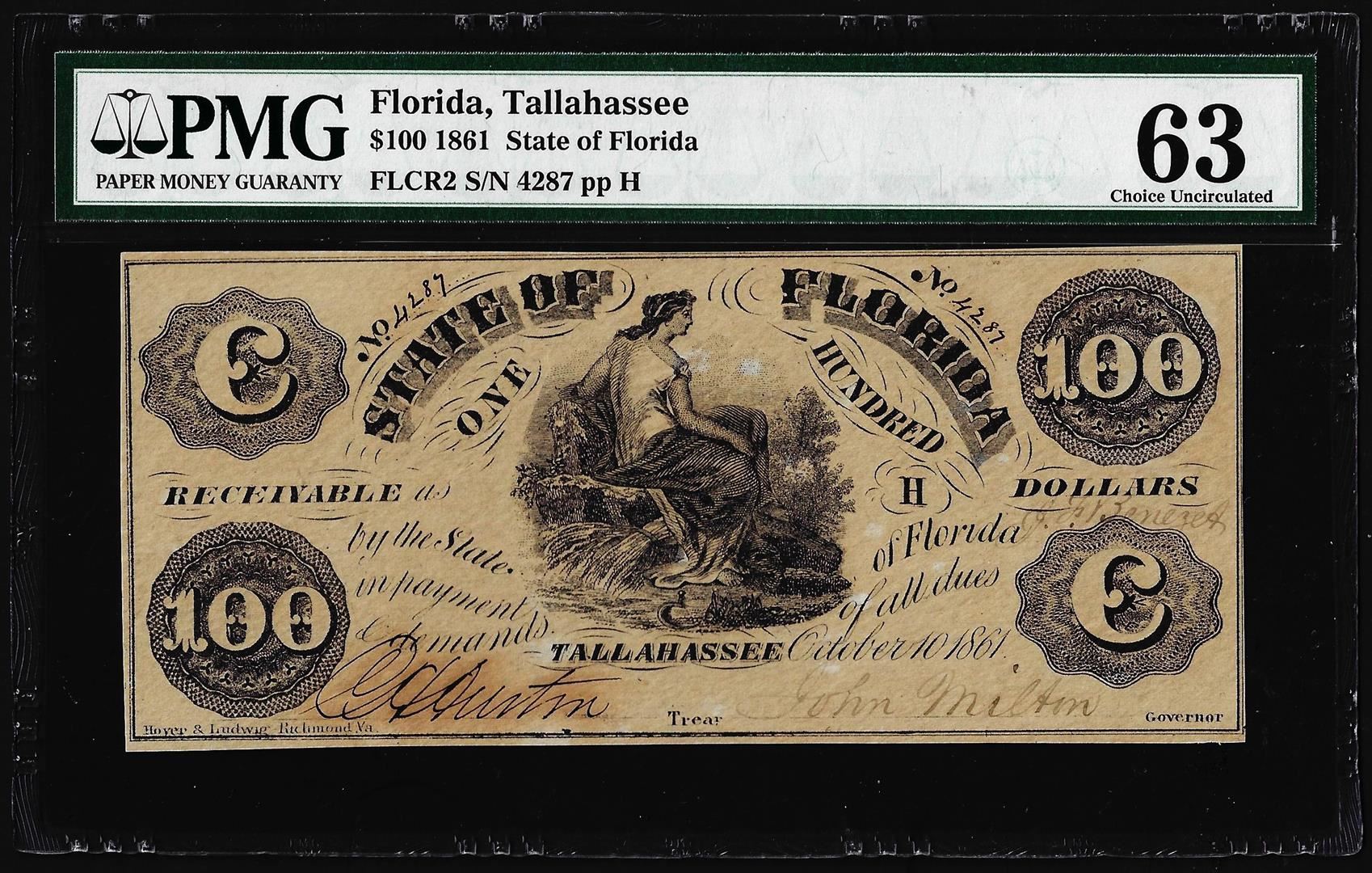 1861 $100 State of Florida Tallahassee Cr.2 Obsolete Note PMG Choice Uncirculated 63