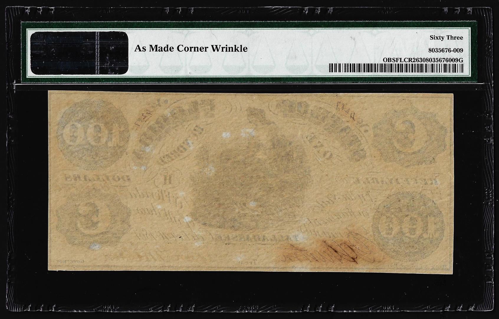 One 1861 $100 State of Florida Tallahassee Cr.2 Obsolete Note PMG Choice Uncirculated 63. PMG Certified.