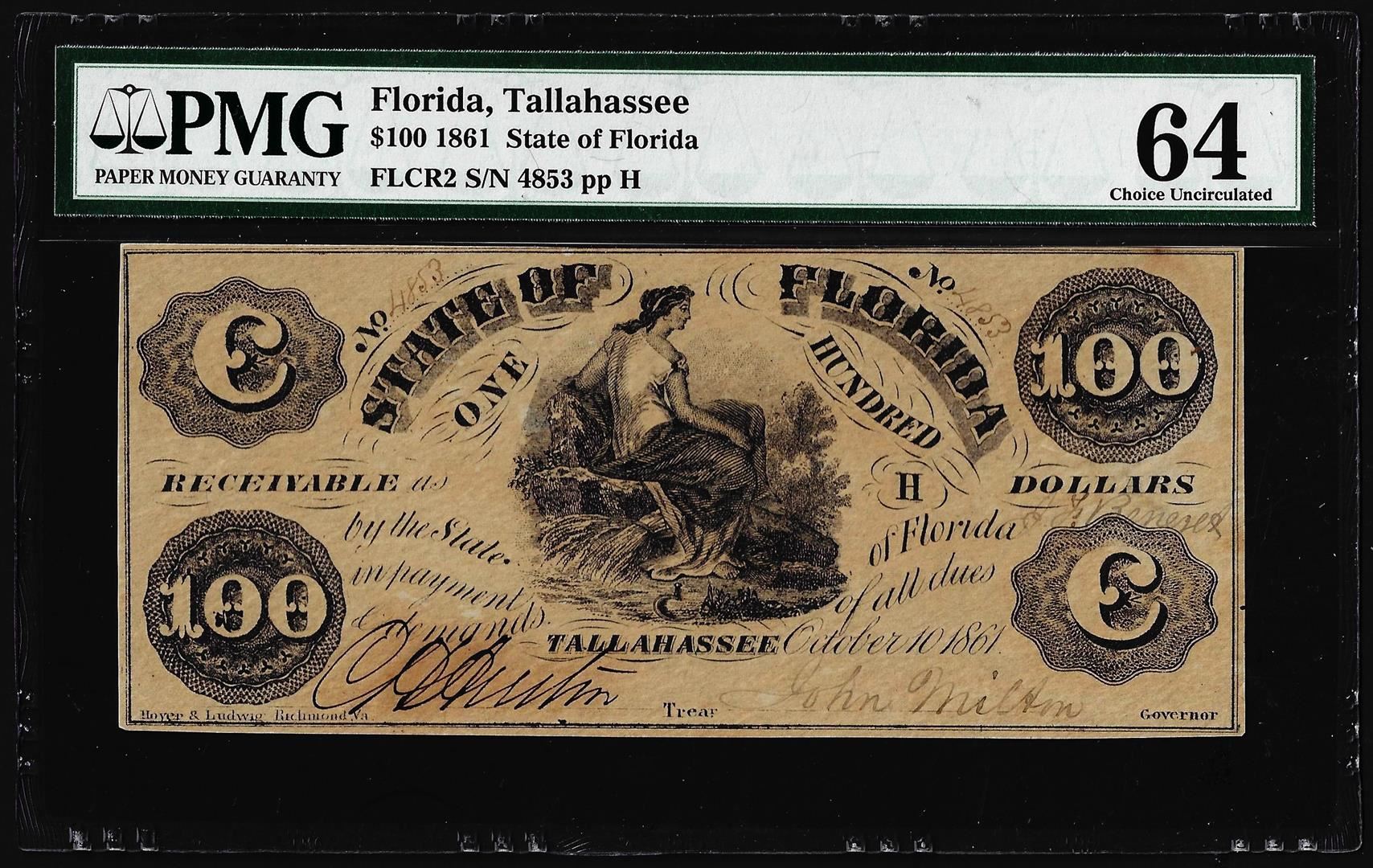 One 1861 $100 State of Florida Tallahassee Cr.2 Obsolete Note PMG Choice Uncirculated 64. PMG Certified.