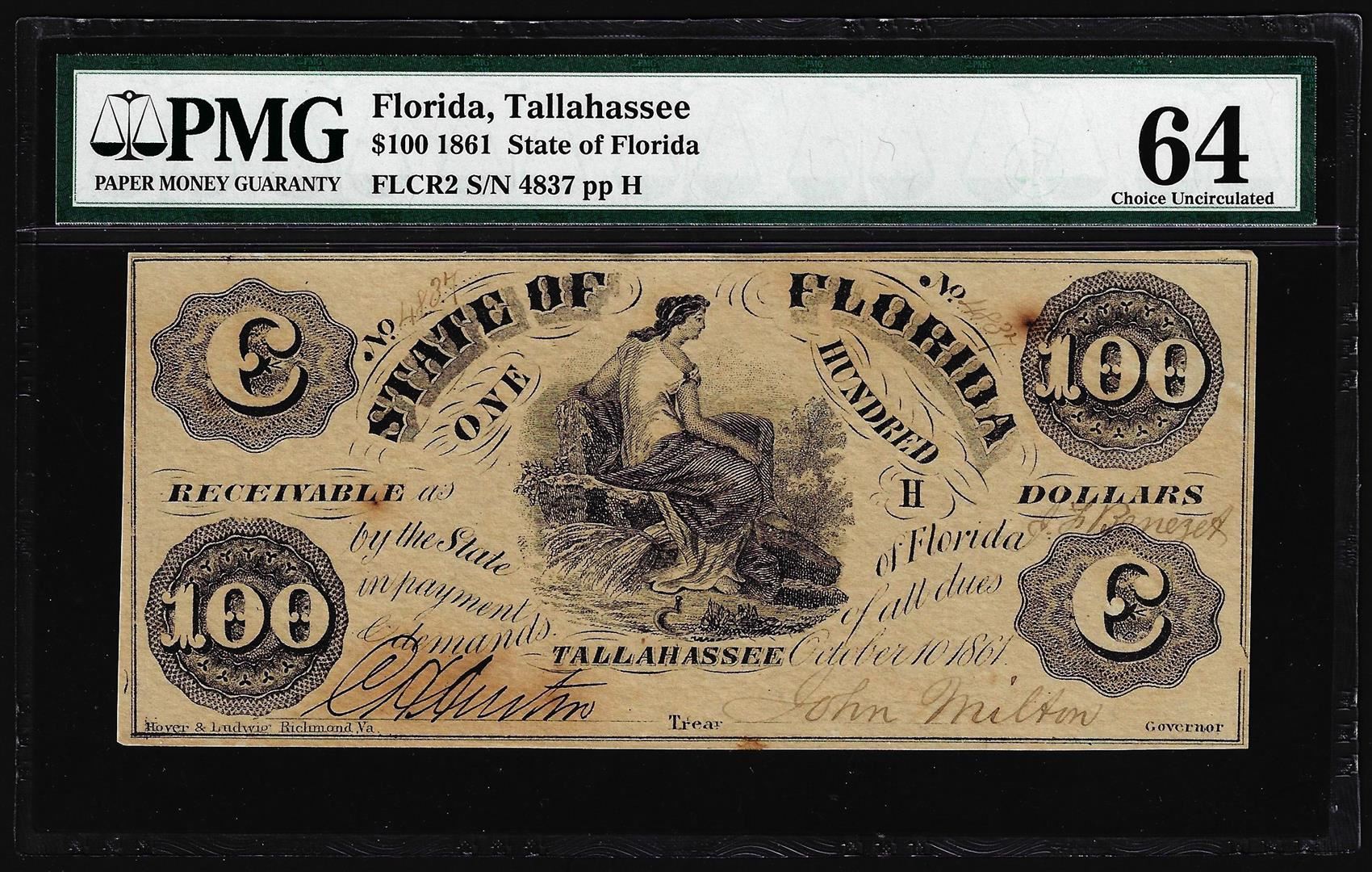 One 1861 $100 State of Florida Tallahassee Cr.2 Obsolete Note PMG Choice Uncirculated 64. PMG Certified.