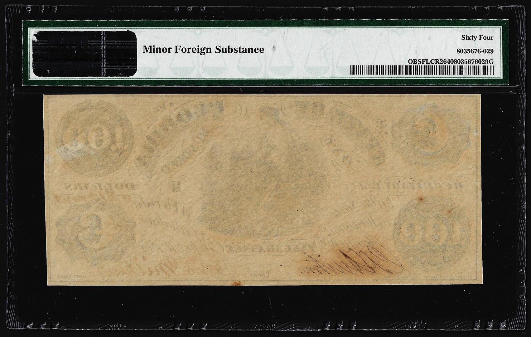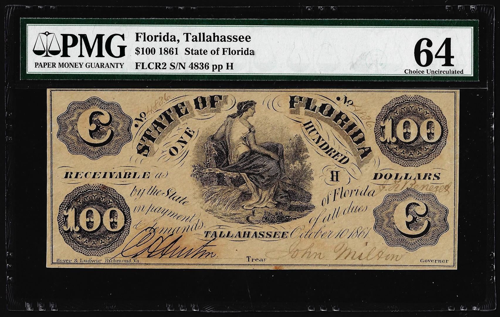 One 1861 $100 State of Florida Tallahassee Cr.2 Obsolete Note PMG Choice Uncirculated 64. PMG Certified.