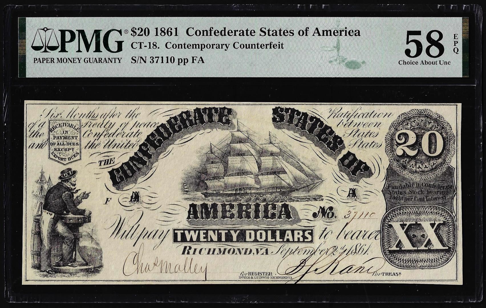 1861 $20 Confederate States CT-18 Contemporary Counterfeit PMG Choice About Unci 58EPQ