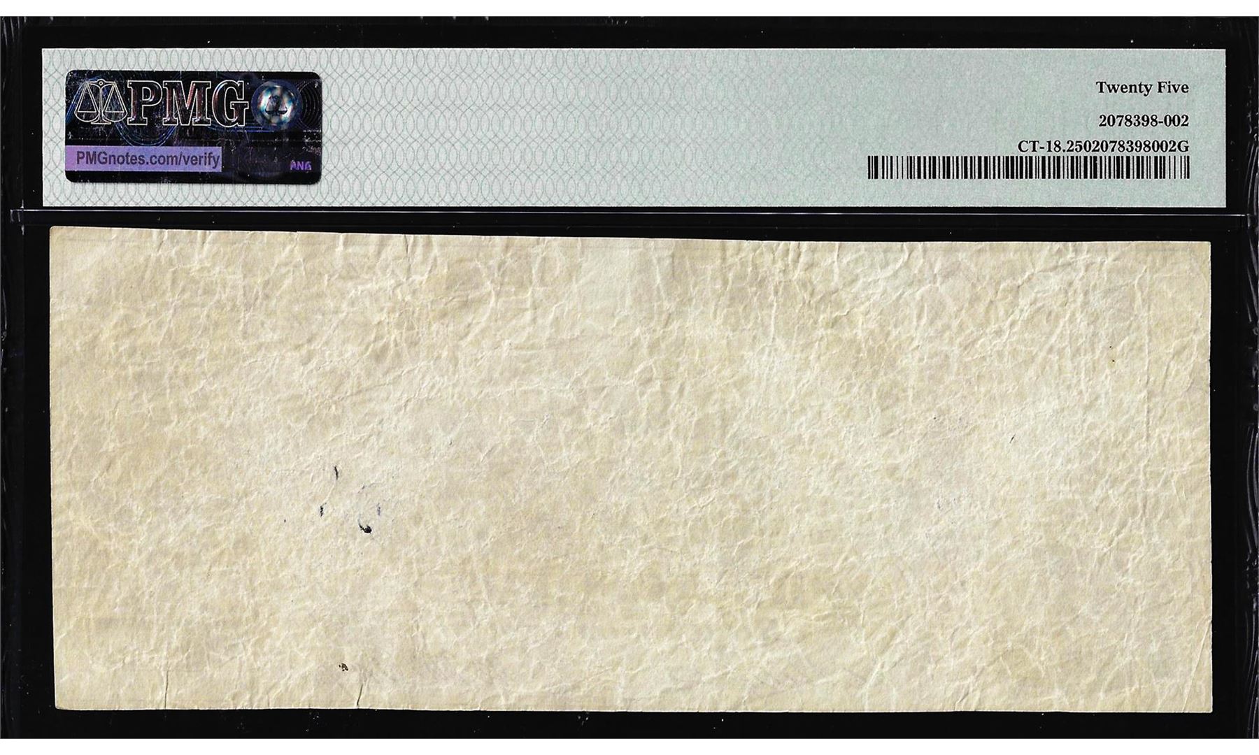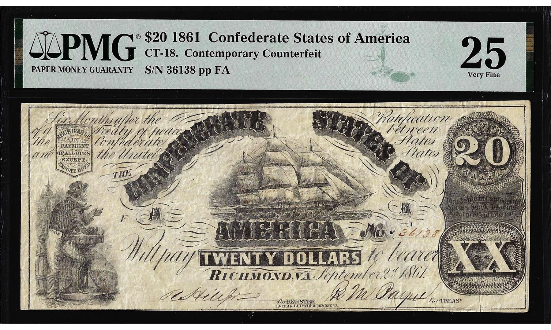 One 1861 $20 Confederate States of America Contemporary Counterfeit Note CT-18 PMG VF25. PMG Certified.