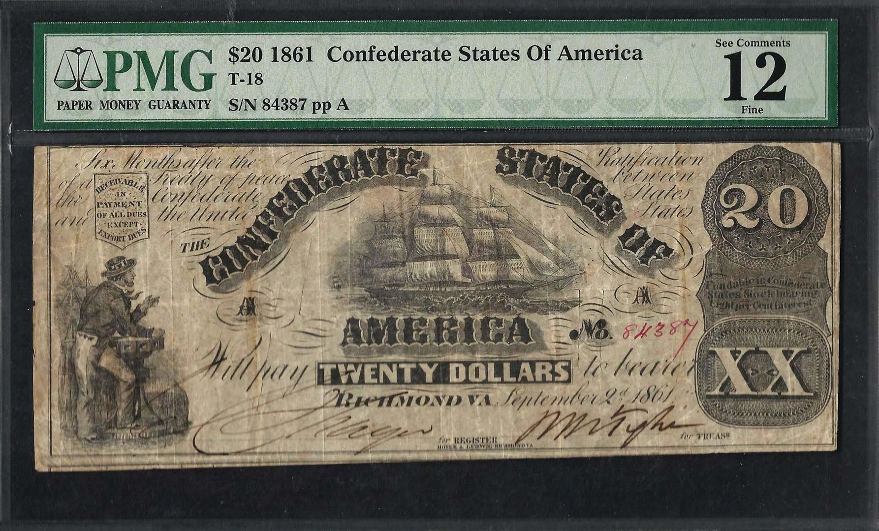 1861 $20 Confederate States of America Note T-18 PMG Fine 12 Cut Cancel