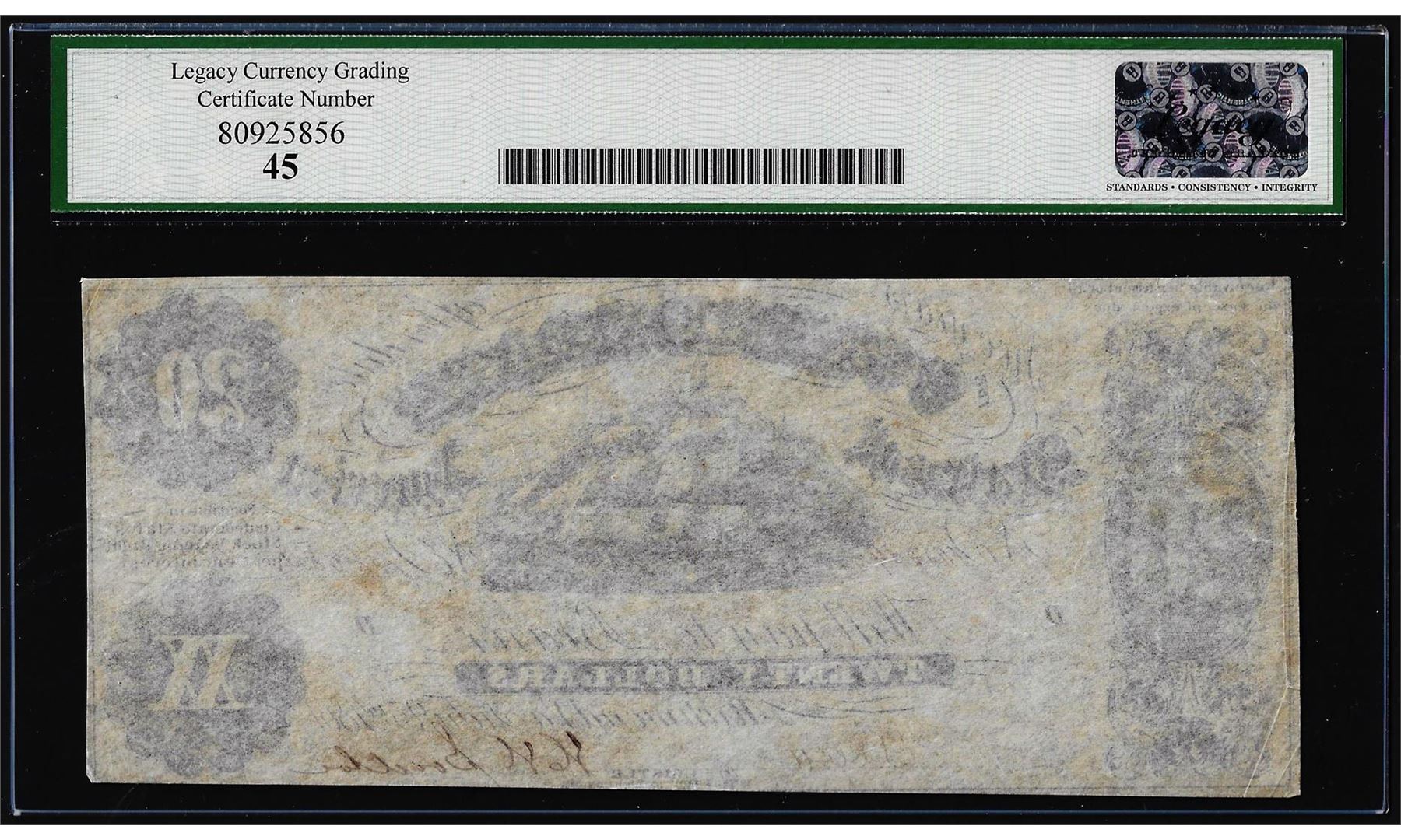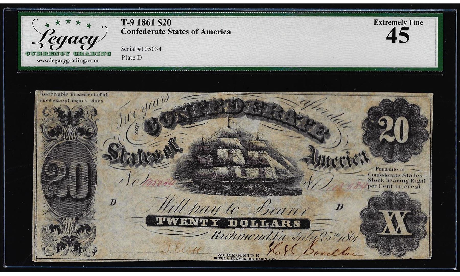 One 1861 $20 Confederate States of America Note T-9 Legacy Extremely Fine 45. Legacy Graded.