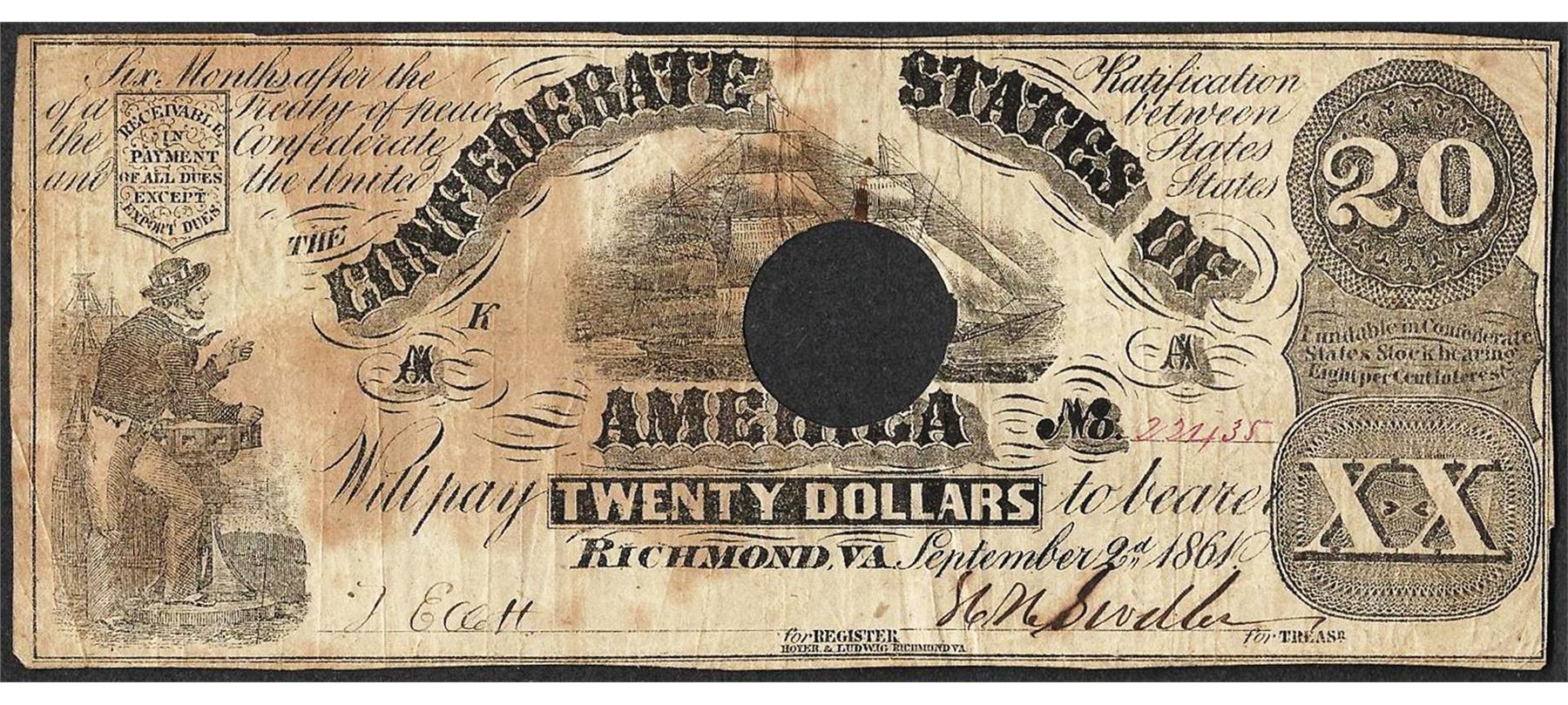 One 1861 $20 Confederate States of America Note.